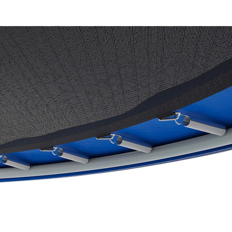 Trambulina realizata din polipropilena elastica si carbon lipit termic. Constructie din otel rezistent la deformare pentru a rezista la sarcini. Arcurile galvanizate sunt acoperite cu un material special de absorbtie a socurilor captusit cu burete, care asigura siguranta si previne coroziunea. Componentele din otel ale structurii sunt astfel protejate de efectele daunatoare ale intemperiilor. Materialele utilizate sunt rezistente la razele UV si, prin urmare, rezistente la decolorarea culorii. Trambulina este echipata cu o plasa de inchidere pe ambele parti prin intermediul unui fermoar.