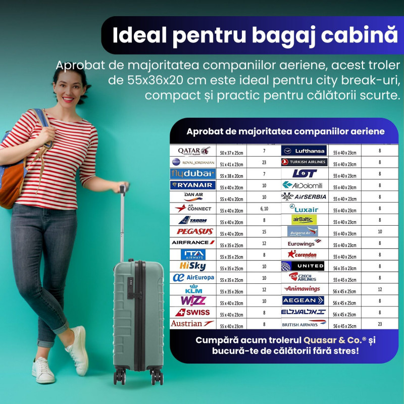 Trolerul S de la Quasar & Co.® , a fost creat special pentru calatorii. Este mic incat sa fie considerat bagaj de cabina, dar foarte usor de manevrat, silentios si spatios pentru ca tu sa te bucuri de tot confortul atunci cand calatoresti.