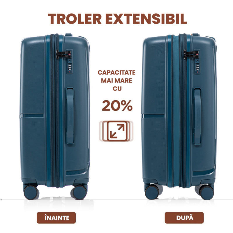 Perfect pentru calatorii cu avionul, acest troler Model AERO, dimensiune L de 76x47x32-35 cm extensibil dispune de 4 roti duble cu rotatie de 360° pentru manevrabilitate usoara. Fabricat din Polipropilena, rezistent, are maner telescopic, cifru si fermoar antifurt pentru siguranta.