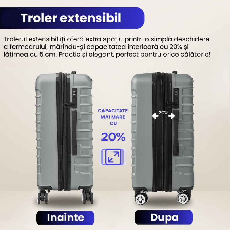 Perfect pentru calatorii cu avionul, acest troler de 77 x 49 x 31-36 cm extensibil dispune de 4 roti duble cu rotatie de 360° pentru manevrabilitate usoara. Fabricat din ABS rezistent, are maner telescopic, cifru si fermoar antifurt pentru siguranta.