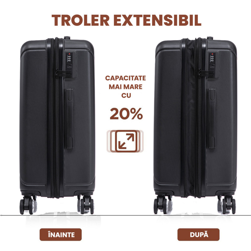 - Valiza este extensibila, oferind o extracapacitate cu 20%, ideala pentru situatiile in care ai nevoie de mai mult spatiu.