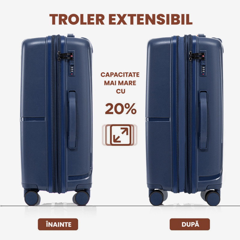 - Valiza este extensibila, oferind o extracapacitate cu 20%, ideala pentru situatiile in care ai nevoie de mai mult spatiu.