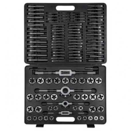 Trusa filiere si tarozi Neo 11-915. Set de 100 piese. Set universal utilizat pentru filetare sau gaurire, externa si interna- 35 x 2 buc. tarozi: M2x0.4mm; M3x0,5mm; M4x0,7mm; M5x0,8mm; M6x0,75mm; M6x1,0mm; M7x0,75mm; M7x1,0mm; M8x0,75mm; M8x1,0mm; M8x1,25mm; M9x0,75mm; M9x1,0mm; M9x1,25mm; M10x0,75mm; M10x1,0mm; M10x1,25mm; M10x1,5mm; M11x0,75mm; M11x1,0mm; M11x1,25mm; M11x1,5mm; M12x0,75mm; M12x1,0mm; M12x1,25mm; M12x1,5mm; M12x1,75mm; M14x1,0mm; M14x1,25mm; M14x1,5mm; M14x2,0mm; M16x1,0mm; M16x1,5mm; M16x2,0mm; M18x1,5mm;- 35 buc. filiere: M2x0.4mm; M3x0,5mm; M4x0,7mm; M5x0,8mm; M6x0,75mm; M6x1,0mm; M7x0,75mm; M7x1,0mm; M8x0,75mm; M8x1,0mm; M8x1,25mm; M9x0,75mm; M9x1,0mm; M9x1,25mm; M10x0,75mm; M10x1,0mm; M10x1,25mm; M10x1,5mm; M11x0,75mm; M11x1,0mm; M11x1,25mm; M11x1,5mm; M12x0,75mm; M12x1,0mm; M12x1,25mm; M12x1,5mm; M12x1,75mm; M14x1,0mm; M14x1,25mm; M14x1,5mm; M14x2,0mm; M16x1,0mm; M16x1,5mm; M16x2,0mm; M18x1,5mm;- 2 buc. Port filiere: 25 mm si 38 mm- 2 buc. Port tarozi: M3 - M12 si M6 - M20- 1 buc. Port tarozi tip T cu eliberare repida: M3 - M6- Valiza metalica de transport- Dimensiune valiza: 36,00 x 7,20 x 47,50 cm