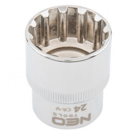 Tubulara (ref. 08-596) dimensiune 24 mm, fabricat din otel crom vanadiu durabil, conform standardului DIN 3124. Forma sferica a tubularei ofera o gama foarte larga de aplicatii, facand posibila desurubarea suruburilor torx, spline, 12 unghiuri, metrice, inch si patrate. Calitatea uneltei este confirmata de certificatul TÜV si de garantia de 25 de ani a producatorului. Marca Neo raspunde asteptarilor profesionistilor.