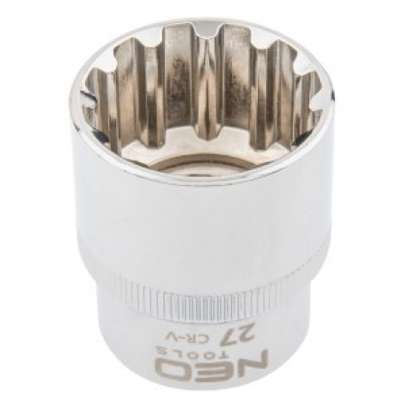 Tubulara (ref. 08-597) dimensiune 27 mm, fabricat din otel crom vanadiu durabil, conform standardului DIN 3124. Forma sferica a tubularei ofera o gama foarte larga de aplicatii, facand posibila desurubarea suruburilor torx, spline, 12 unghiuri, metrice, inch si patrate. Calitatea uneltei este confirmata de certificatul TÜV si de garantia de 25 de ani a producatorului. Marca Neo raspunde asteptarilor profesionistilor.