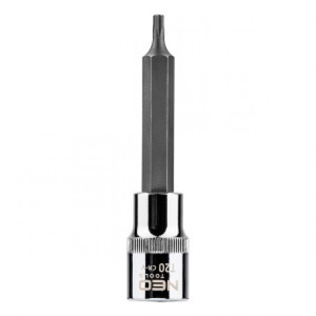 Tubulara cu Bit Torx lung 1/2",T20 X 100 mm, Neo 08-760. Este fabricata din otel crom vanadiu de inalta calitate. Capat hexagonal din otel aliat S2 de inalta calitate. Calitatea instrumentului o confirma certificatul TÜV si garantia de 25 de ani a producatorului. Marca Neo indeplineste asteptarile profesionistilor.