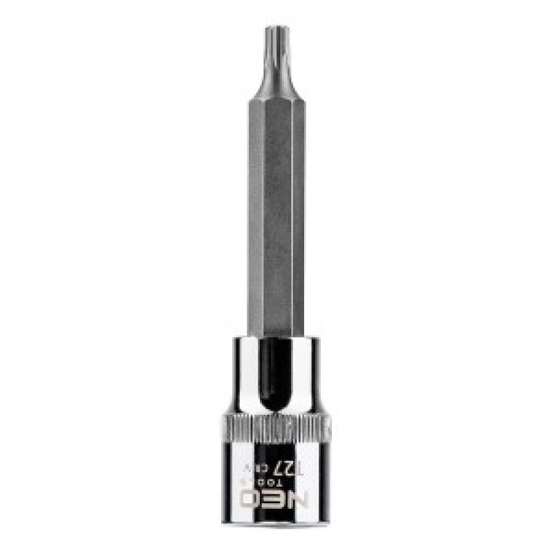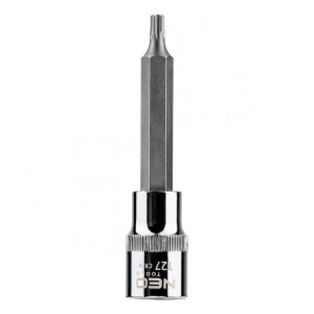 Varf Torx pe tubulara de 1/2" NEO (ref. 08-762) dimensiune T27, lungime 100 mm. tubulara este fabricat din otel crom vanadiu durabil. Capatul hexagonal este fabricat din otel aliat S2 de inalta calitate. Calitatea uneltei este confirmata de certificatul TÜV si de garantia de 25 de ani a producatorului. Marca NEO raspunde asteptarilor profesionistilor.