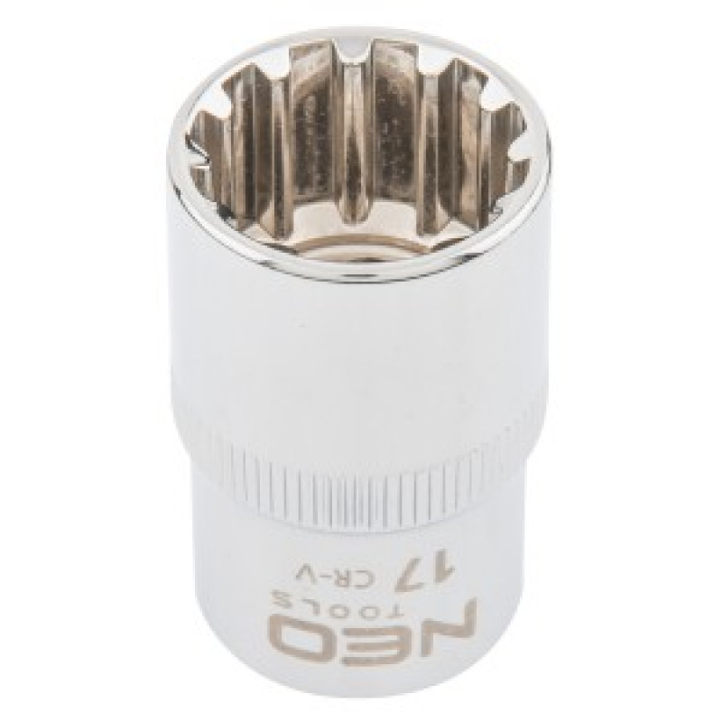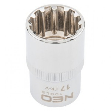 Tubulara (ref. 08-589) dimensiune 17 mm, fabricat din otel crom vanadiu durabil, conform standardului DIN 3124. Forma sferica a tubularei ofera o gama foarte larga de aplicatii, facand posibila desurubarea suruburilor torx, spline, 12 unghiuri, metrice, inch si patrate. Calitatea uneltei este confirmata de certificatul TÜV si de garantia de 25 de ani a producatorului. Marca Neo raspunde asteptarilor profesionistilor.