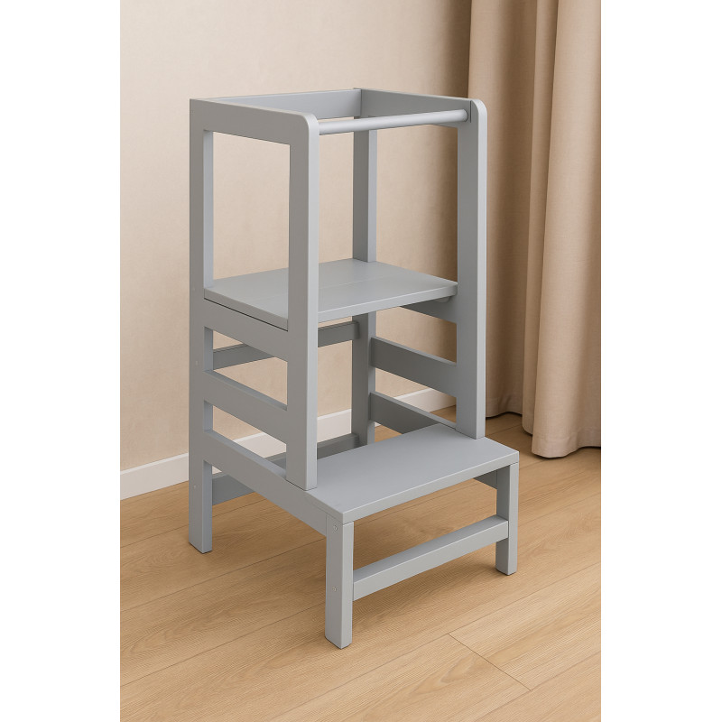 Varsta recomandata: 12 luni+ Scurta descriere Turn de invatare din lemn de pin, cu platforma reglabila pe trei niveluri de inaltime. Construit solid, cu finisaje sigure pentru copii, este ideal pentru a permite celor mici sa participe in siguranta la activitati zilnice in bucatarie sau alte spatii.