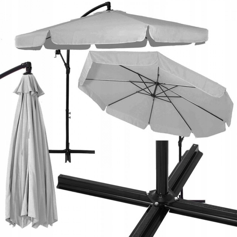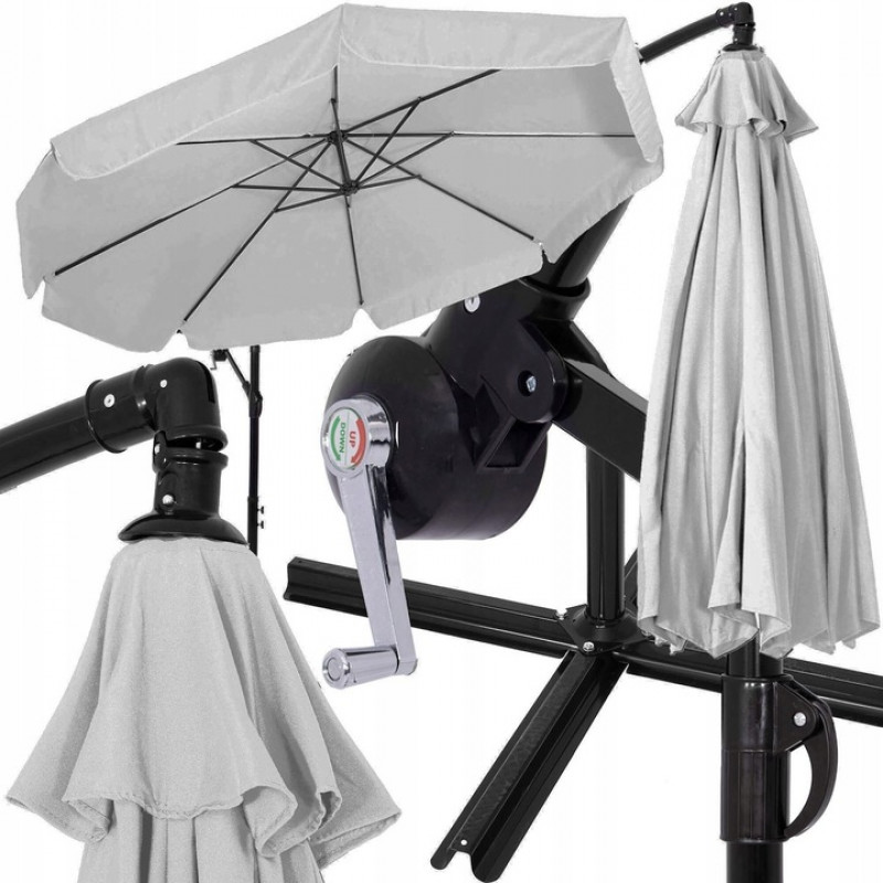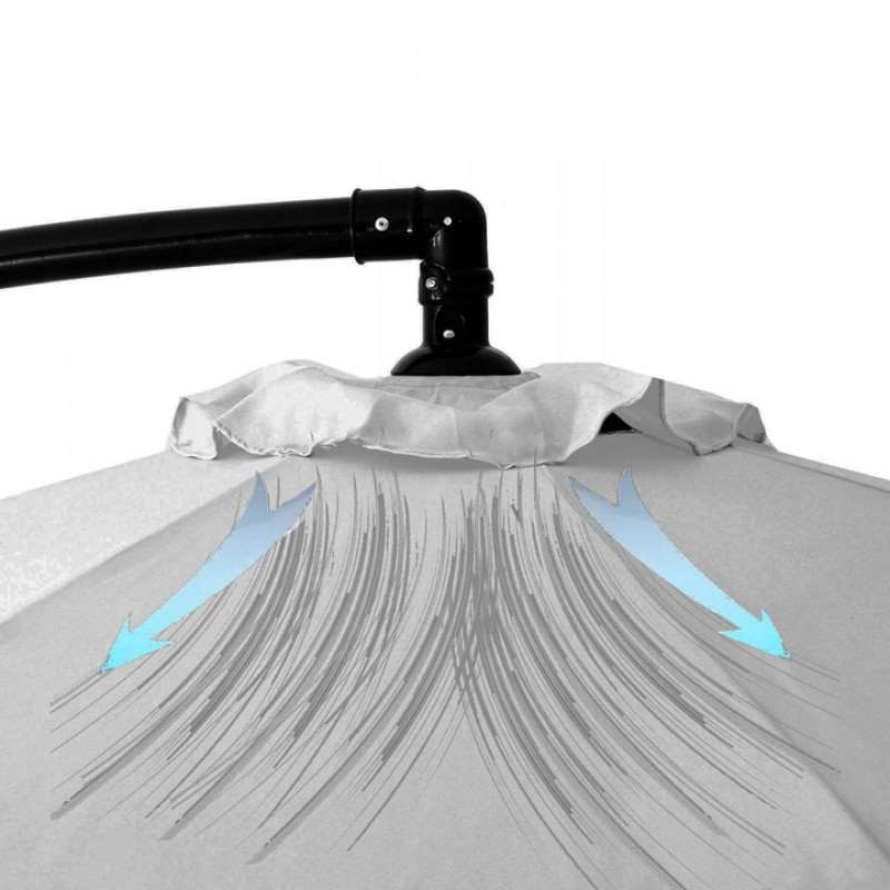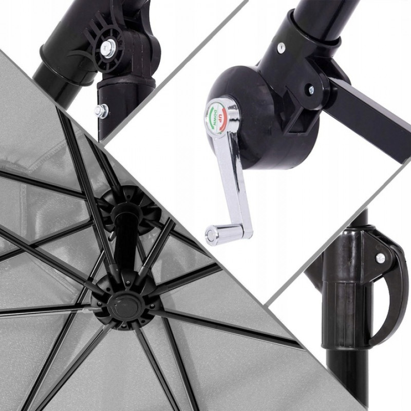 Husa practica si usoara - va proteja copertina atunci cand nu folositi umbrela Pentru a creste stabilitatea si siguranta, de exemplu, in cazul unor rafale de vant neasteptate, umbrela este echipata cu o baza larga, a carei deschidere este de pana la 100 cm. In plus, fiecare dintre picioarele sale este echipat cu gauri, datorita carora puteti folosi ancore sau suruburi speciale dedicate unei anumite suprafete pentru a atasa permanent baza intr-un loc convenabil. Forma elementelor de baza va permite, de asemenea, sa adaugati greutate suplimentara daca o considerati o solutie mai potrivita. IMPORTANT! Nu uitati sa nu lasati umbrela deschisa in caz de vant puternic.