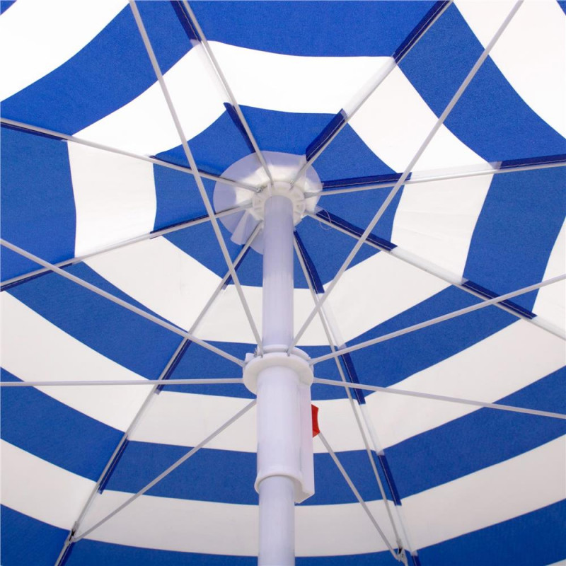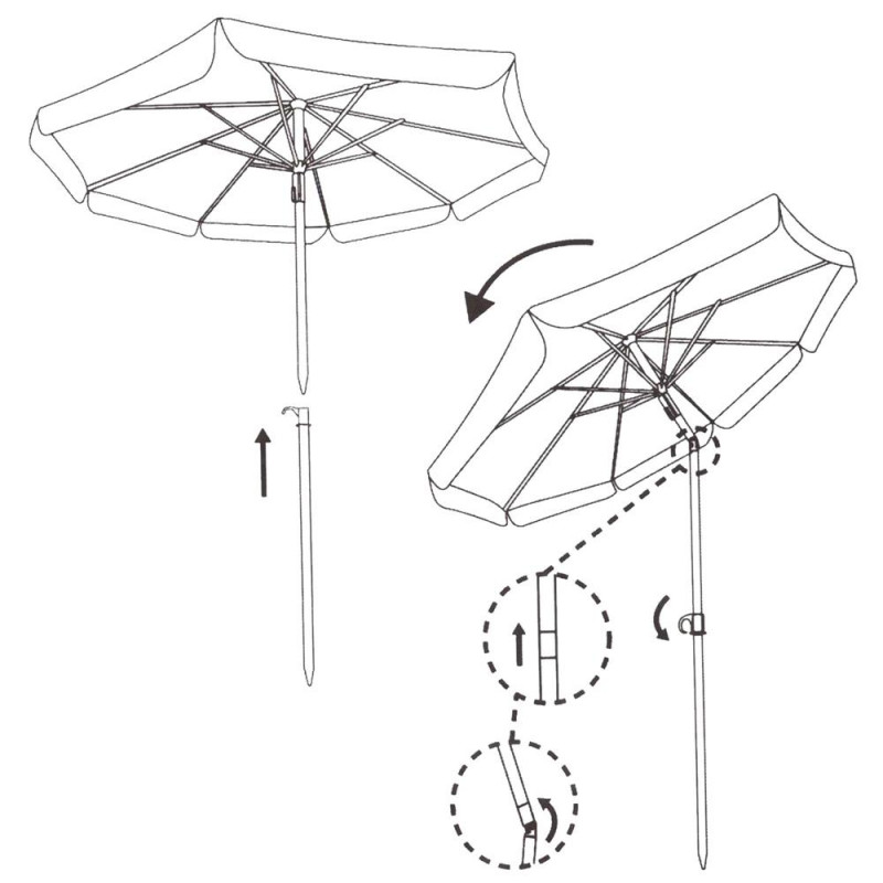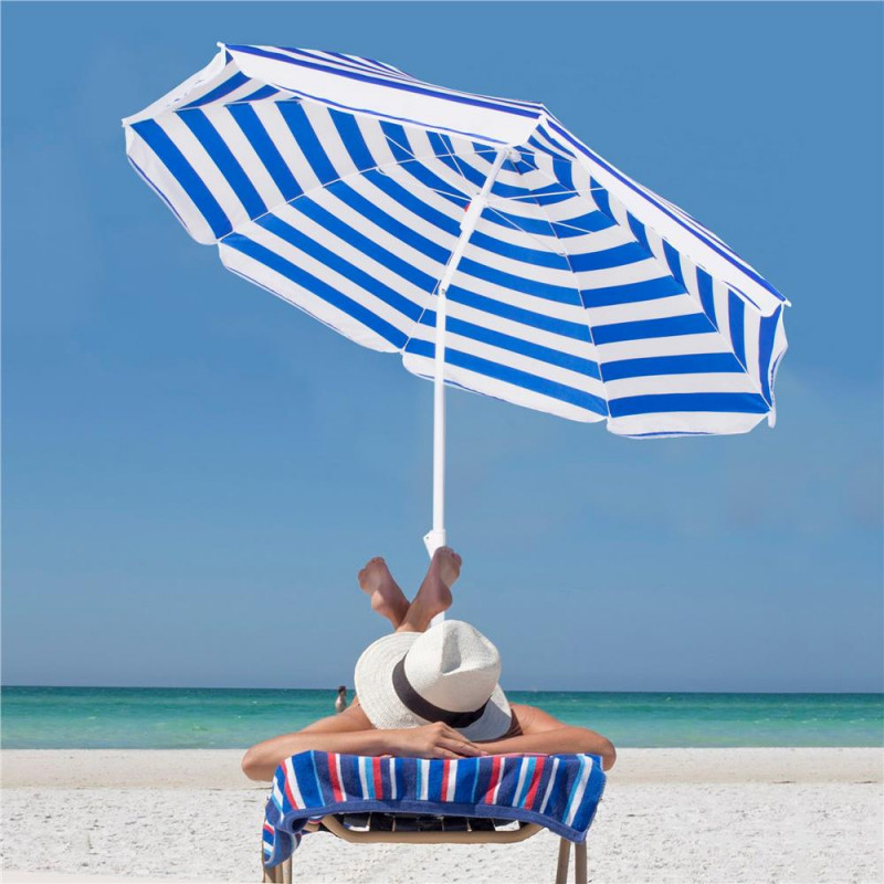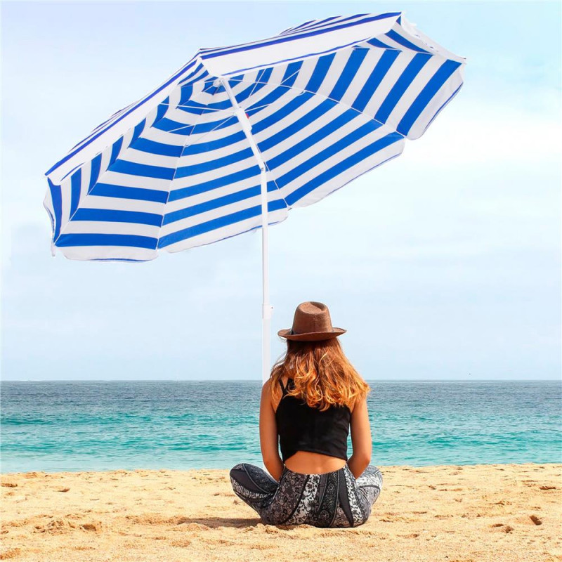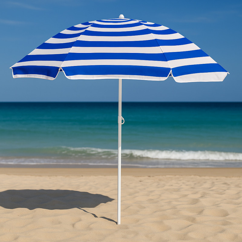 Scurta descriere: Aceasta umbrela de plaja ofera umbra generoasa si protectie eficienta in zilele insorite. Este pliabila, usoara si usor de transportat, cu sistem de inclinare si inaltime reglabila. Poate fi fixata direct in sol, fara suport suplimentar, si este potrivita pentru plaja, gradina sau iesiri in aer liber.