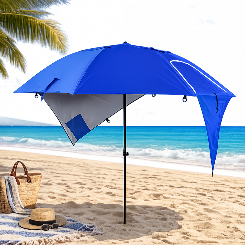 Scurta descriere Parasolul de plaja 2 in 1 cu functie de paravan este alegerea ideala pentru zilele petrecute la mare, in gradina sau pe terasa. Ofera protectie eficienta impotriva soarelui si vantului, dar si un plus de intimitate. Designul inteligent permite transformarea rapida din parasol clasic in paravan lateral, adaptandu-se usor oricarui tip de spatiu.