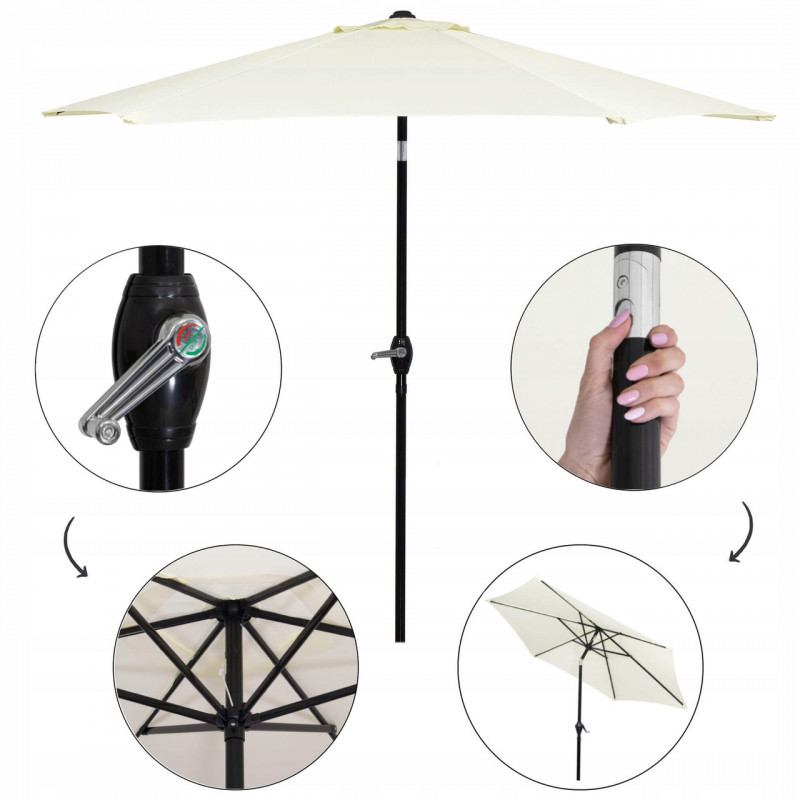 Aceasta umbrela de soare eleganta este perfecta pentru a crea umbra si pentru a va proteja de razele UV daunatoare ale soarelui.Fabricat din poliester cu protectie UV si anti-decolorare, invelisul umbrelei de soare va ofera protectie optima impotriva soarelui si este usor de curatat. Avand un diametru al stalpului de 38 mm, aceasta poate fi montata si in mijlocul meselor prevazute cu orificii pentru umbrele. Designul exclusiv al acestei umbrele de soare va permite sa inclinati umbrela pentru a bloca soarele, atunci cand se indreapta spre orizont. Stalpul robust din otel, impreuna cu cele 8 spite durabile, asigura stabilitate si durabilitate umbrelei. Aceasta umbrela de gradina poate fi deschisa si inchisa cu usurinta datorita mecanismului cu manivela . Produsul este usor de asamblat.Va rugam sa retineti ca recomandam tratarea materialul umbrelei cu un spray pentru impermeabilizare, daca aceasta va fi expusa ploilor abundente.