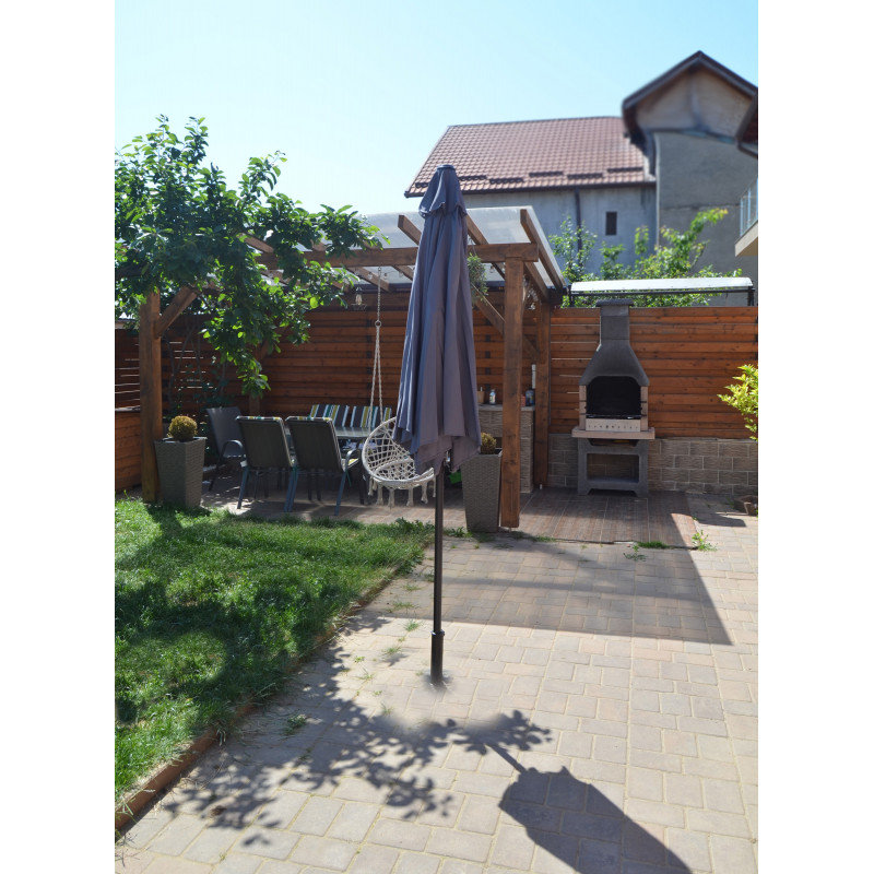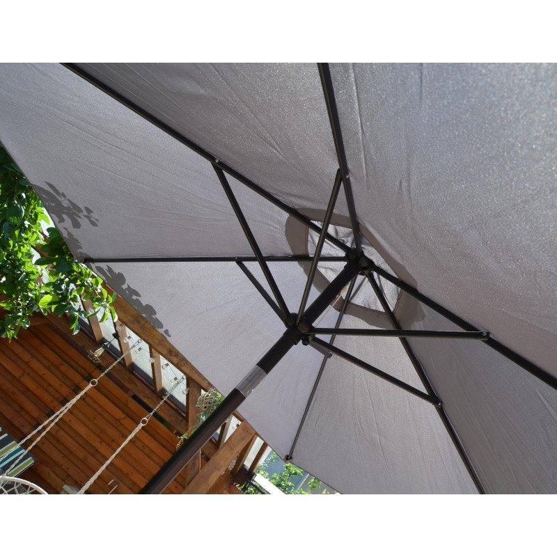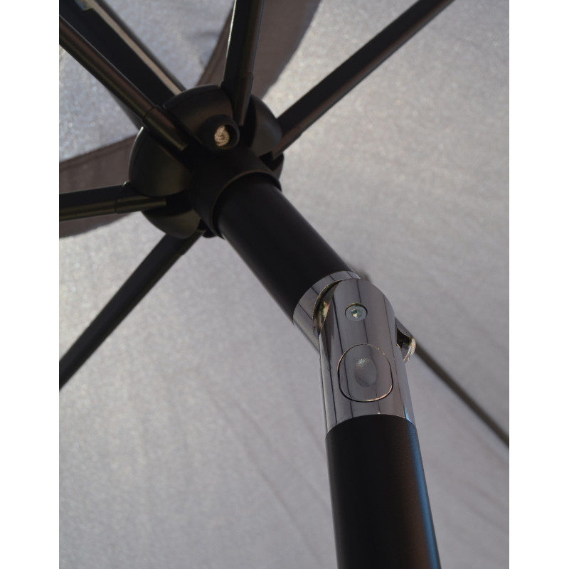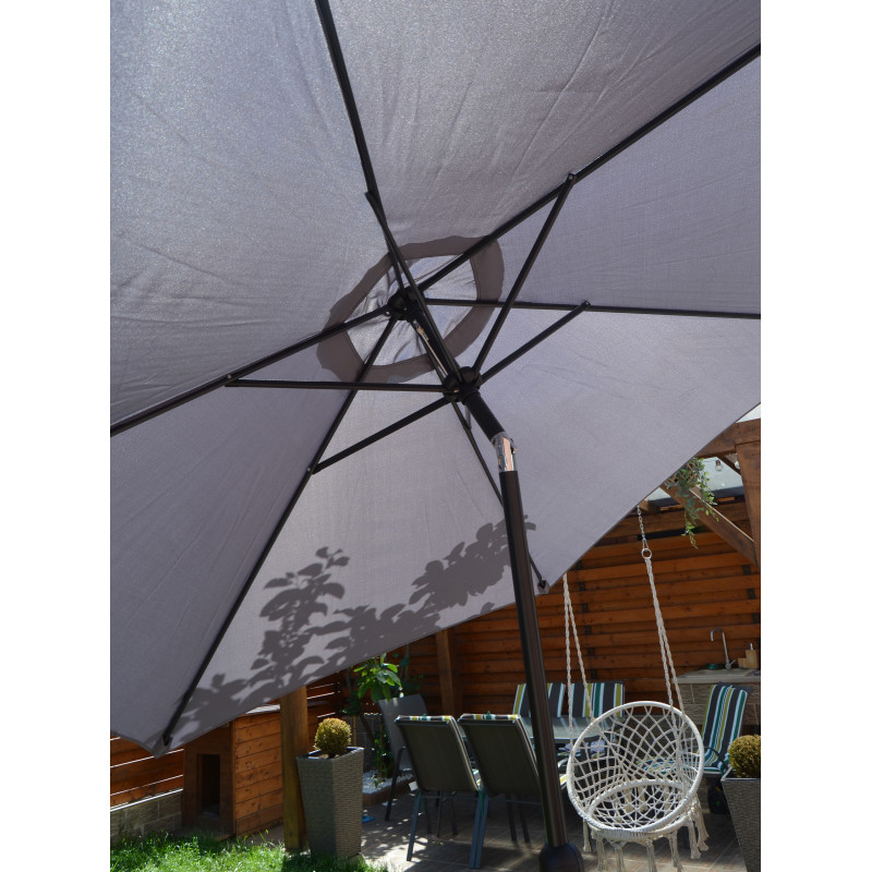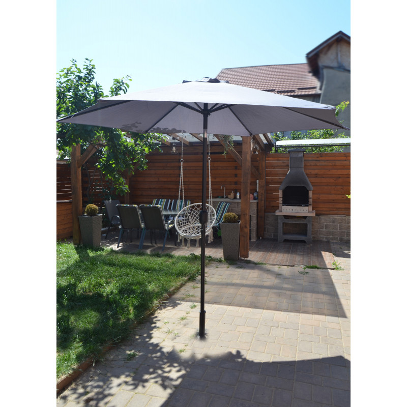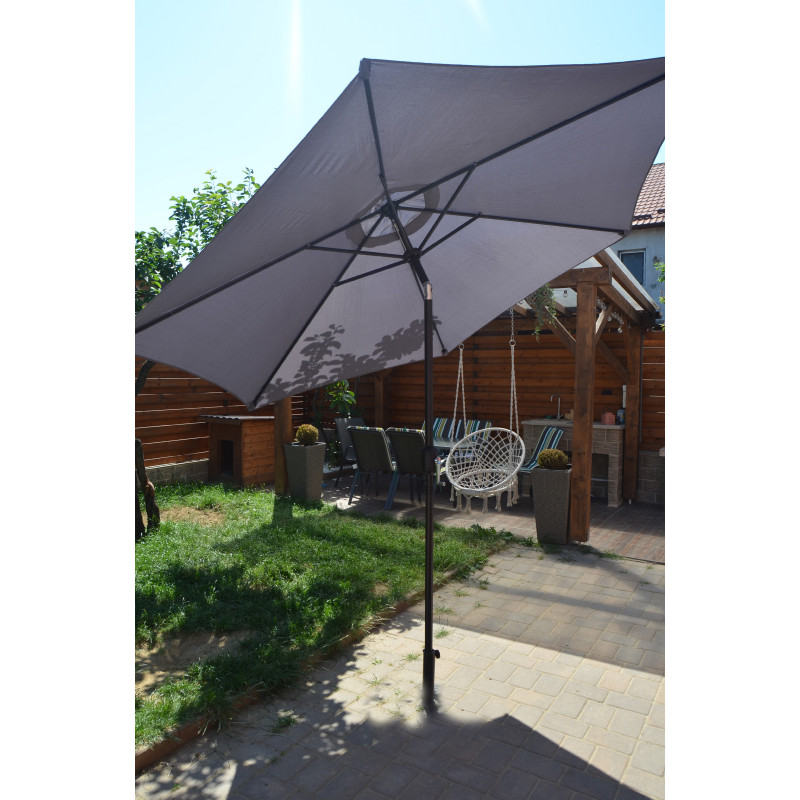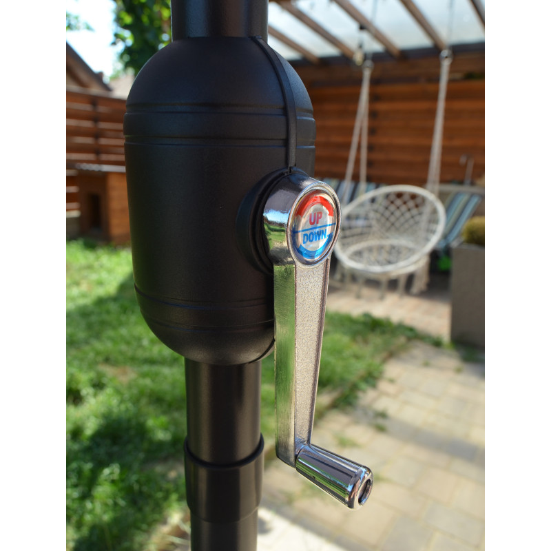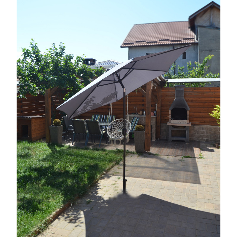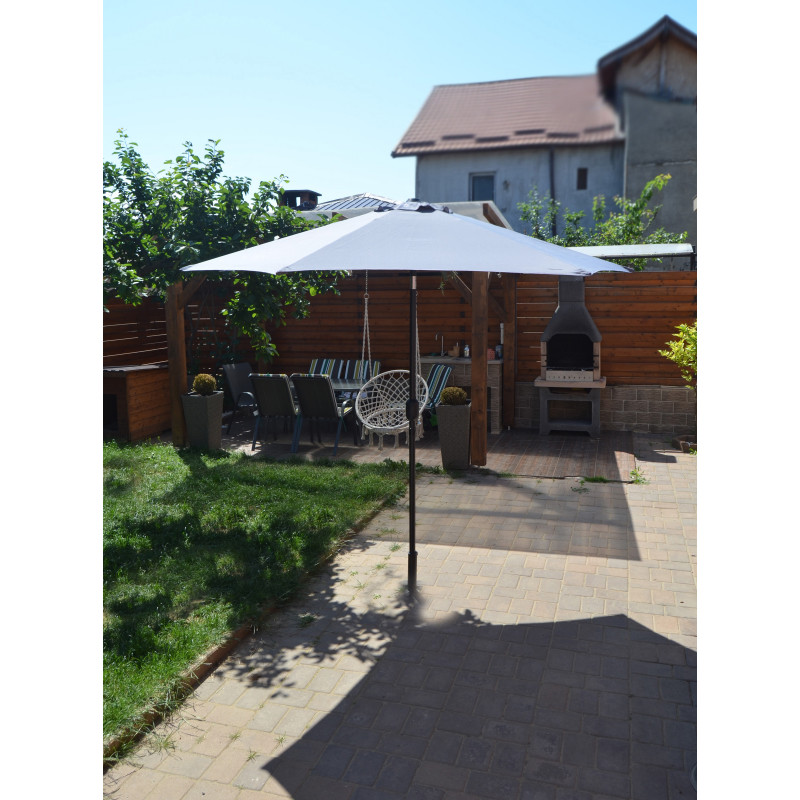 Această umbrelă de soare elegantă este perfectă pentru a crea umbră și pentru a vă proteja de razele UV dăunătoare ale soarelui.Fabricat din poliester cu protecție UV și anti-decolorare, invelișul umbrelei de soare vă oferă protecție optimă impotriva soarelui și este ușor de curățat. Avand un diametru al stalpului de 38 mm, aceasta poate fi montată si in mijlocul meselor prevăzute cu orificii pentru umbrele. Designul exclusiv al acestei umbrele de soare vă permite să inclinați umbrela pentru a bloca soarele, atunci cand se indreaptă spre orizont. Stalpul robust din oțel, impreună cu cele 6 spițe durabile, asigură stabilitate și durabilitate umbrelei. Această umbrelă de grădină poate fi deschisă și inchisă cu ușurință datorită mecanismului cu manivelă . Produsul este ușor de asamblat.Vă rugăm să rețineți că recomandăm tratarea materialul umbrelei cu un spray pentru impermeabilizare, dacă aceasta va fi expusă ploilor abundente.