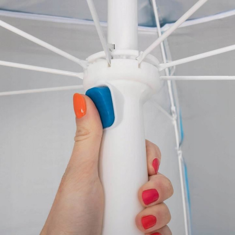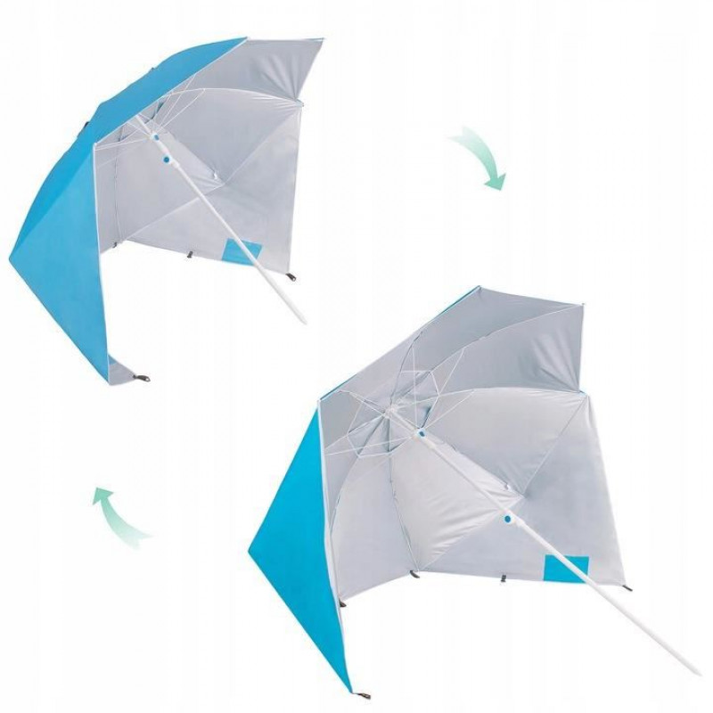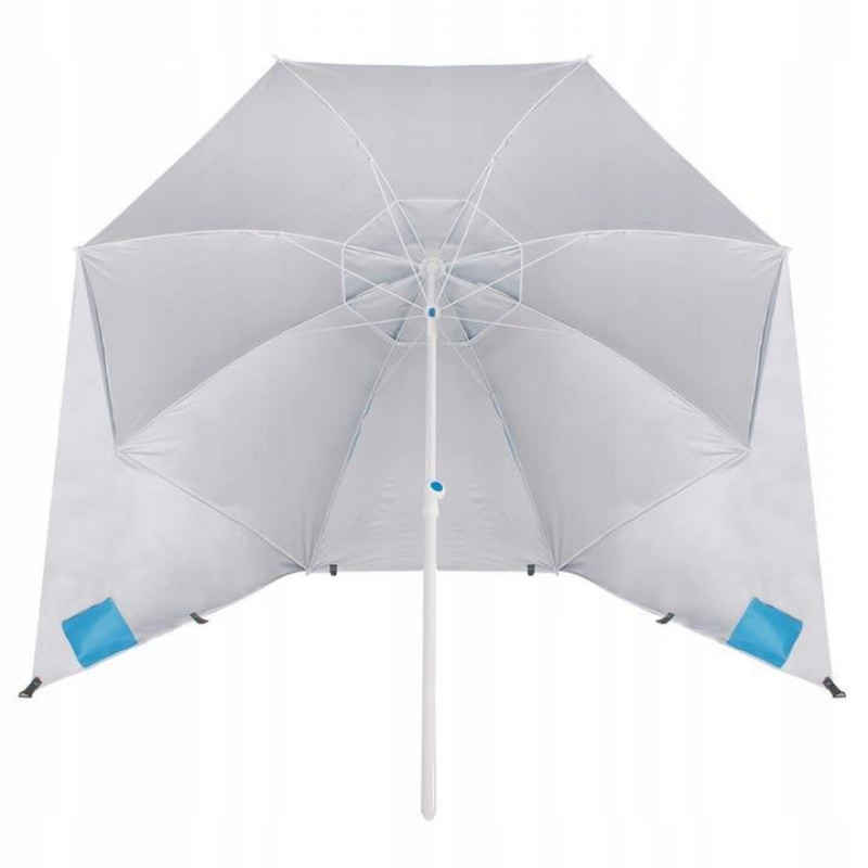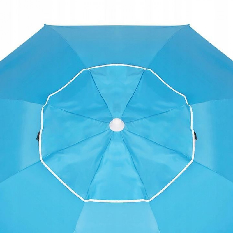 Umbrela plaja, parasolar, albastru, 220 cm Umbrela de plaja in versiunea XXL va fi perfecta pentru a fi folosita la plaja, unde va protejeaza impotriva razelor solare puternice si a vantului.Posibilitatea de a o fixa in sol creste siguranta utilizarii, iar buzunarele laterale pot fi de folos pentru orice accesoriu de plaja ( Doua buzunare va permit sa ascundeti acolo un telefon, ochelari sau alte lucruri)Umbrela este foarte simpla si intuitiva de utilizat. Pentru pliere, apasati doar butonul albastru si apoi se va plia la o dimensiune mica.Datorita husei sale, se poate transporta rapid si foarte usor.Umbrela este reglabila pe inaltime. Acest lucru va permite sa reglati lungimea piciorului de la 140 la 220 cm. Datorita acestui fapt, inaltimea maxima a umbrelei poate fi cuprinsa intre 130-155 cm.Are o gura de aer in partea superioara a baldachinului umbrelei, care asigura o circulatie adecvata a aerului in interiorul acesteia.Umbrela include carlige care va vor ajuta sa o fixati in pamant. Datorita acestora, peretii laterali se vor mentine corespunzator in pozitia dorita.
