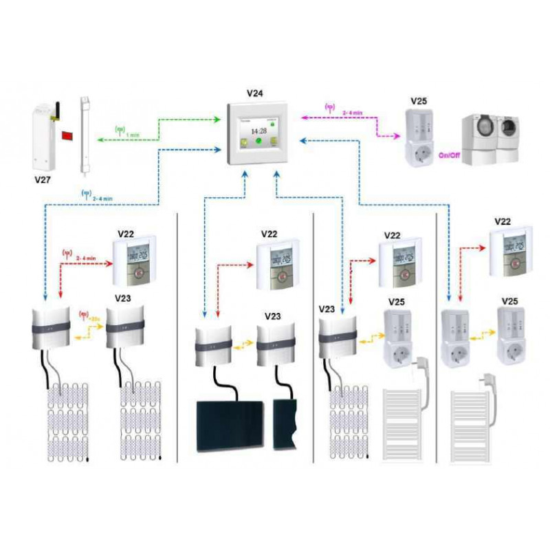 Unitatea functioneaza wirelles impreuna cu termostatul V22 si receptorii acestuia V23 si/sau V25.