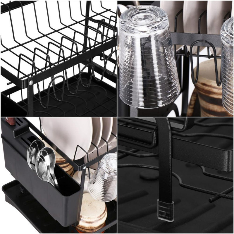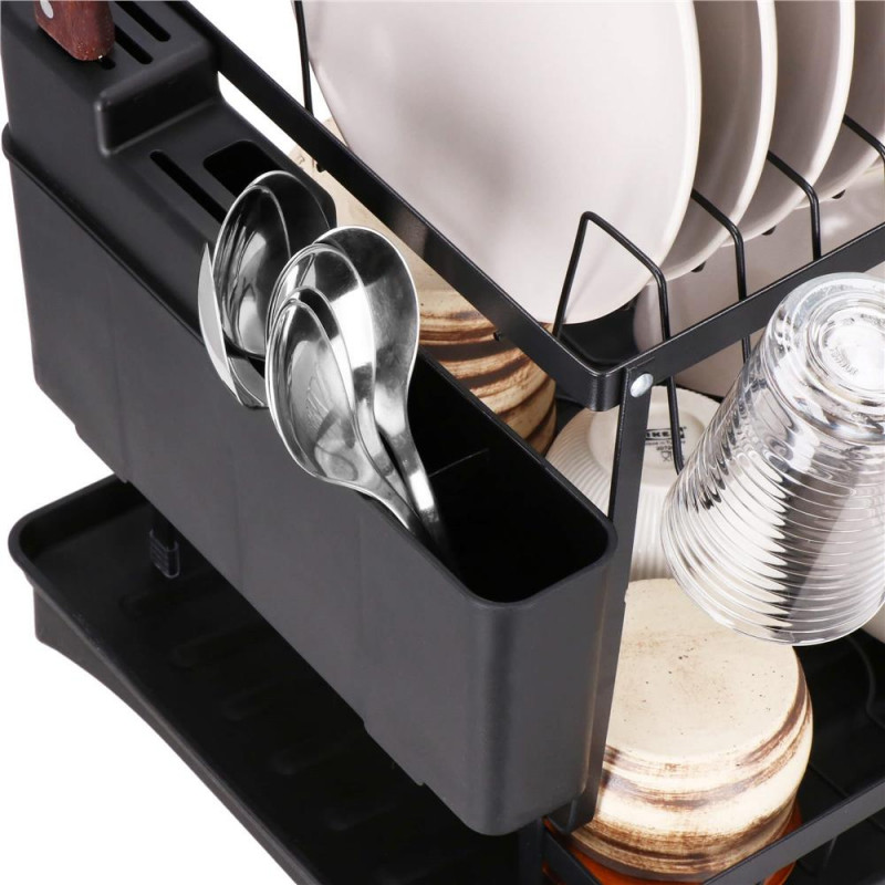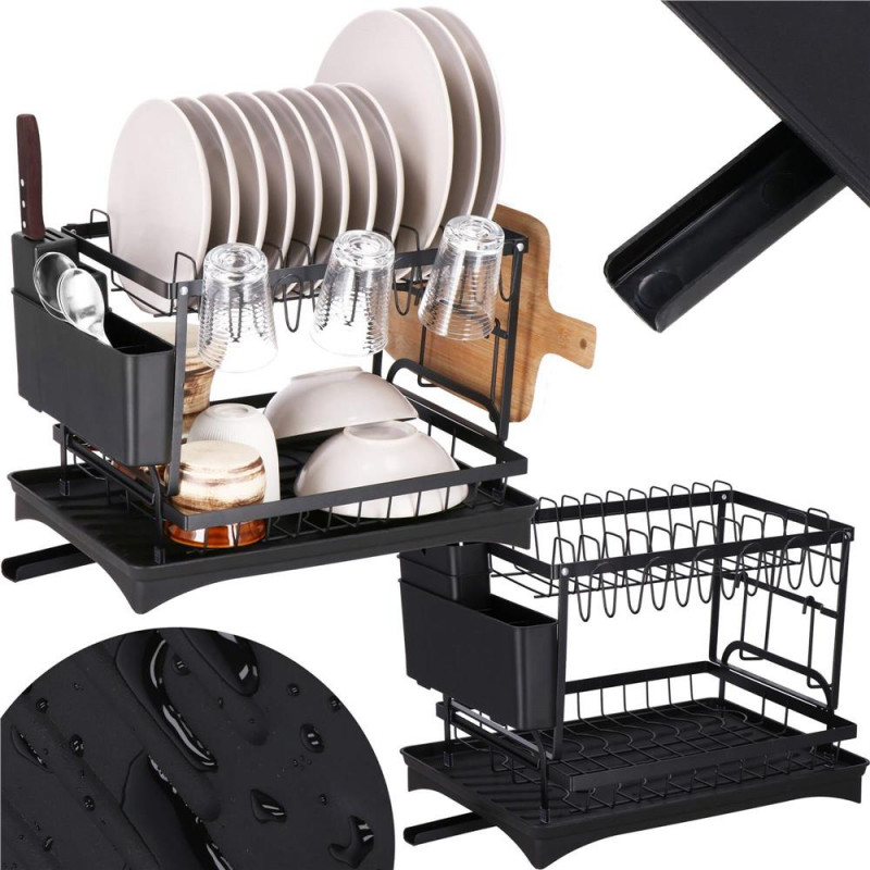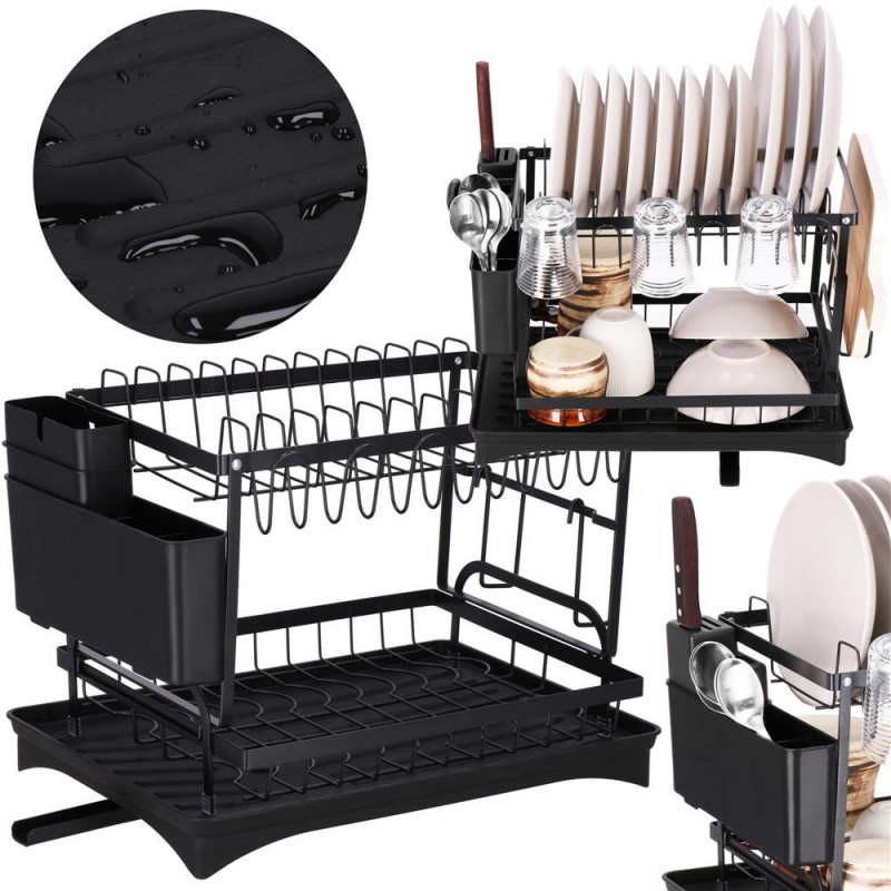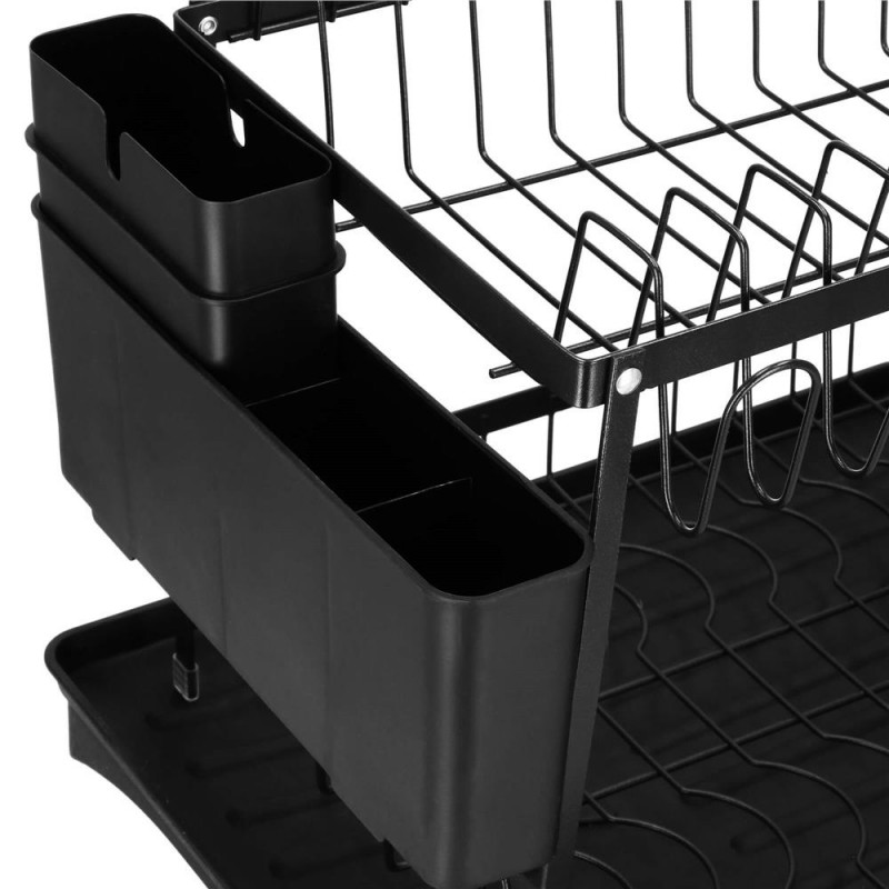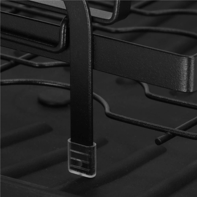 Sistem de drenare a apei catre chiuveta sau o alta scurgere Uscatorul din metal negru pentru tacamuri si alte ustensile de bucatarie cu finisaj mat, este perfect pentru bucataria dvs. Ustensilele umede se vor usca rapid si excesul de apa va fi retinut pe tava de scurgere.