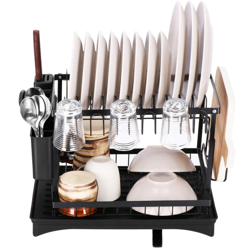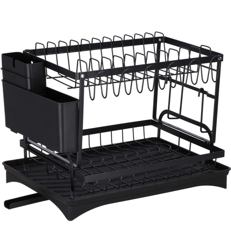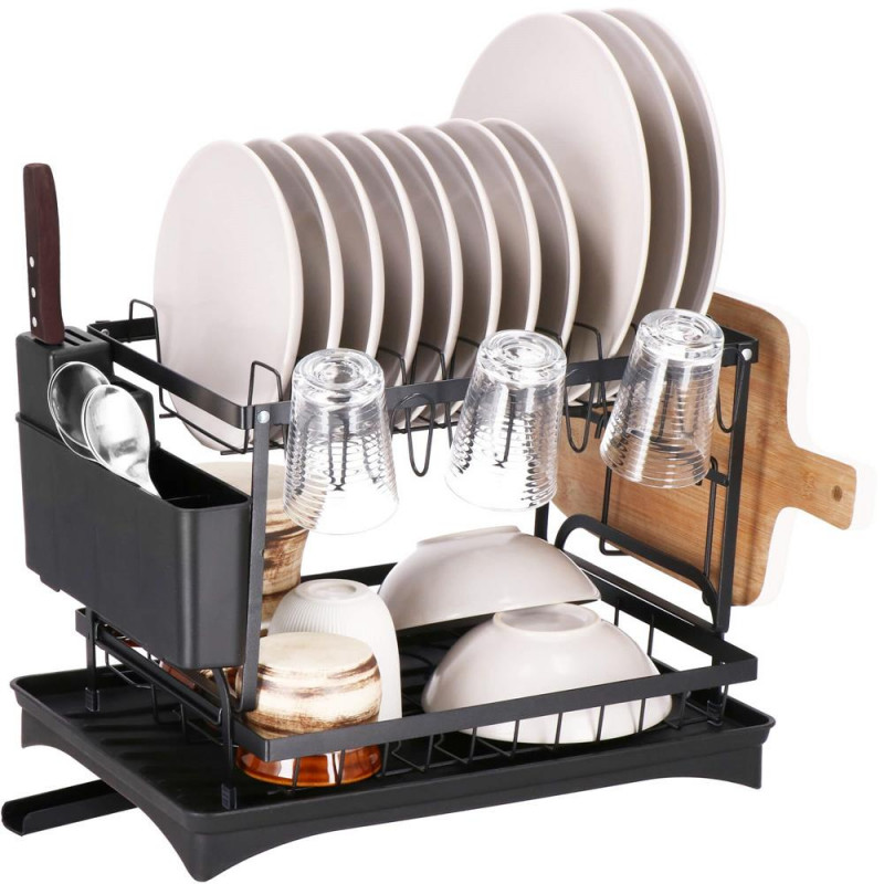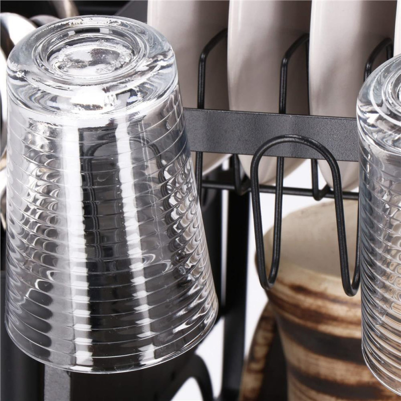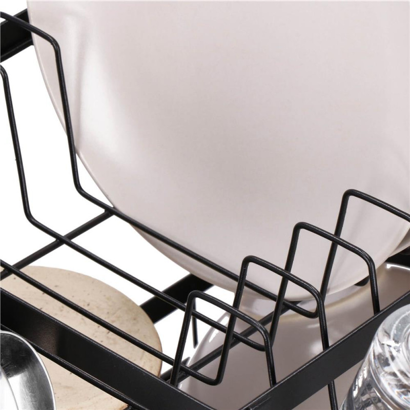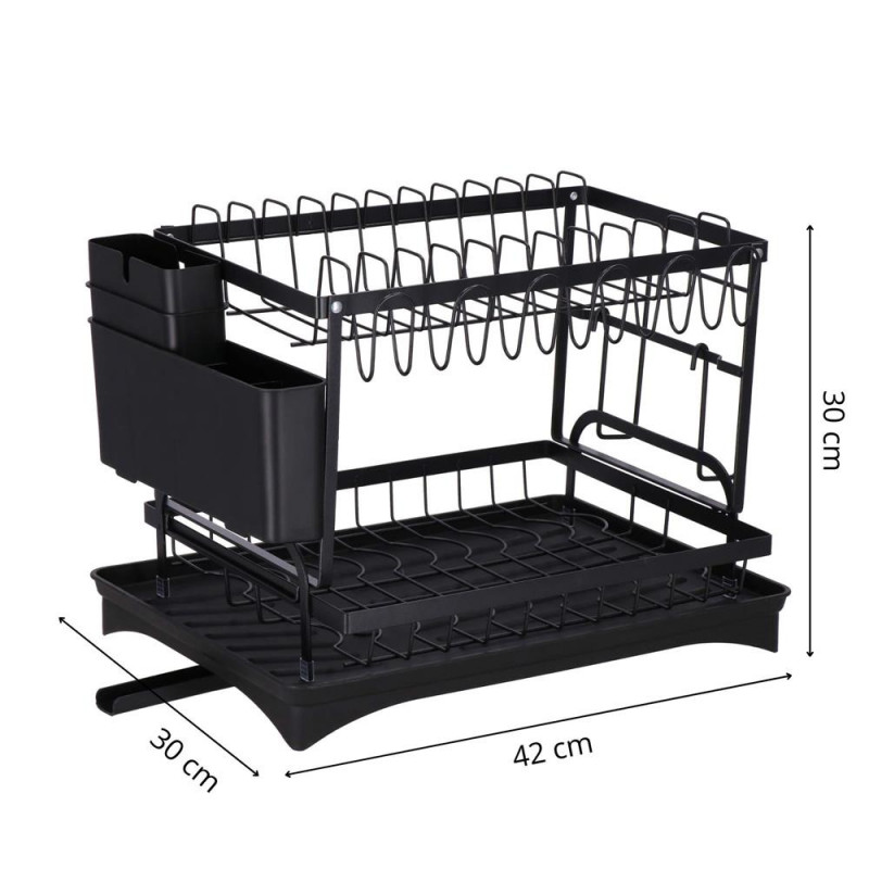 Sistem de drenare a apei catre chiuveta sau o alta scurgere Uscatorul din metal negru pentru tacamuri si alte ustensile de bucatarie cu finisaj mat, este perfect pentru bucataria dvs. Ustensilele umede se vor usca rapid si excesul de apa va fi retinut pe tava de scurgere.