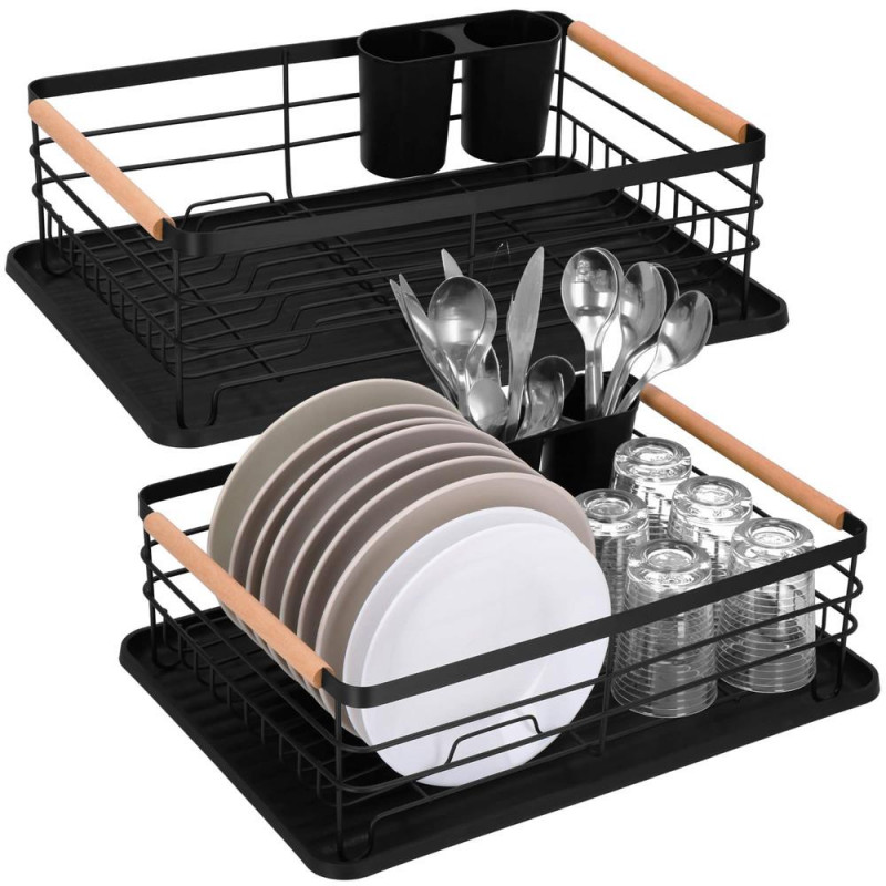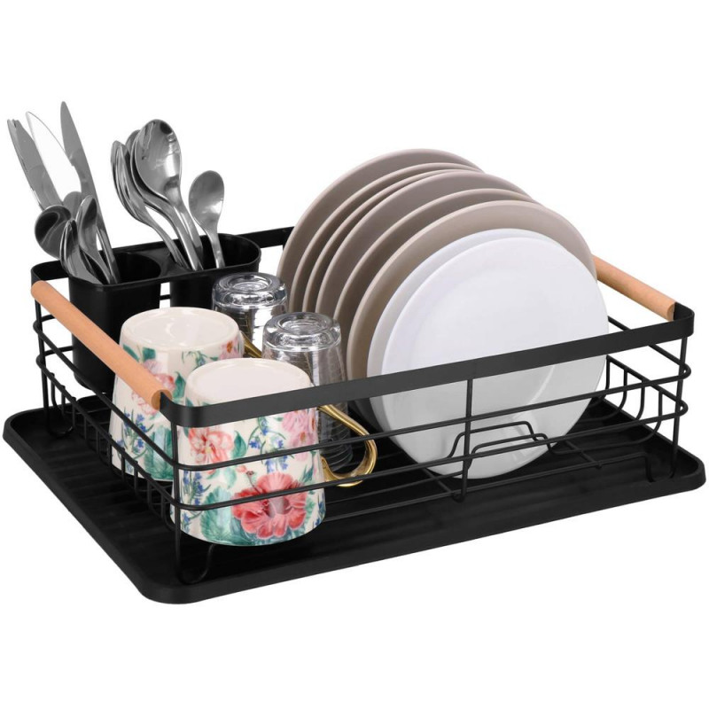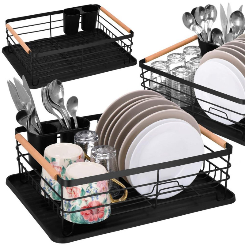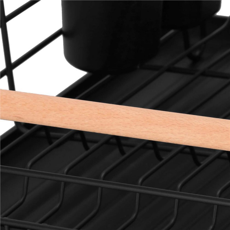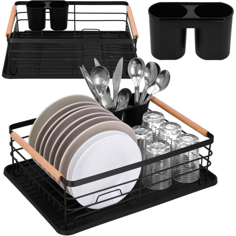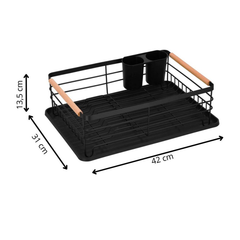 Inaltime totala: 13,5 cm Uscatorul din metal negru pentru tacamuri si alte ustensile de bucatarie cu finisaj mat, este perfect pentru bucataria dvs. Ustensilele umede se vor usca rapid si excesul de apa va fi retinut pe tava de scurgere.