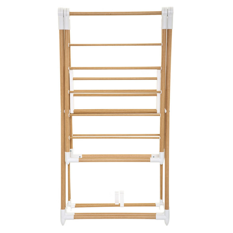 Scurta descriere Acest uscator de rufe pliabil este ideal pentru utilizare zilnica datorita designului sau compact si suprafetei generoase de uscare. Cele doua aripi laterale ofera flexibilitate in organizarea hainelor, iar finisajul cu efect de lemn aduce un plus estetic spatiului tau.