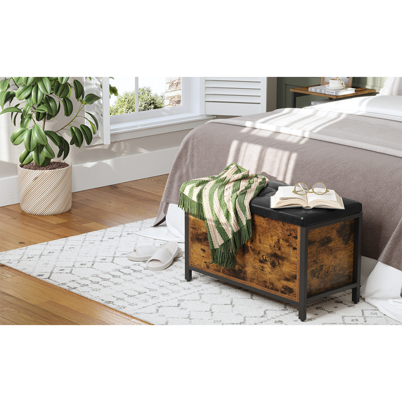 Capacitate de incarcare statica a cutiei interioare: 20 kg Despre acest articol Tapiteria din imitatie de piele, lemnul de inginerie maro rustic si cadrul metalic negru mat se unesc pentru a forma un cufar de depozitare.Ridicati capacul si veti gasi un compartiment mare pentru haine, jucarii sau pantofi. Aceasta cutie ocupa putin spatiu si va permite sa organizati mai bine obiectele care sunt peste tot.Asezati-va aici pentru a va schimba pantofii. Perna captusita este atat de pufoasa si confortabila incat sa stai pe ea este o adevarata placere. Fabricata din placi aglomerate, aceasta banca poate sustine pana la 150 kg.Cand depozitati lucruri, nu este nevoie sa tineti capacul. Balamaua de siguranta il mentine intr-o pozitie fixa.Usor de asamblat si de curatat: Datorita