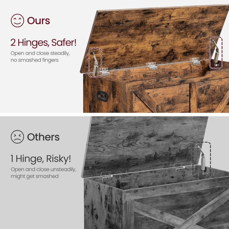 Capacitate de incarcare statica: 100 kg Descriere produs C ombinand PAL rustic si designul usii in stil hambar, aceasta banca de depozitare atragatoare aduce o atmosfera calda de ferma casei tale, transformandu-ti casa intr-un loc mai confortabil si primitor.Depozitare, cu cat este mai mare, cu atat mai bine! Deschideti acest cufar si veti gasi un compartiment spatios de 100 x 40 x 46 cm pentru jucarii, haine sau paturi pentru copii. In plus, „blatul” mare este perfect pentru a va expune piesele decorative. Manere practice si balamale de siguranta: Cu cele 2 manere, puteti muta cu usurinta acest cufar de jucarii pe hol, camera de joaca sau camera de zi. Dar cele 2 balamale? Iti protejeaza degetele impotriva eventualelor raniri. Stai jos pentru a-ti schimba pantofii: Cadrul din PAL al acestei banci de pantofi poate suporta pana la 100 kg, facandu-l puternic si durabil. Puteti lua loc si va puteti schimba pantofii cu incredere.