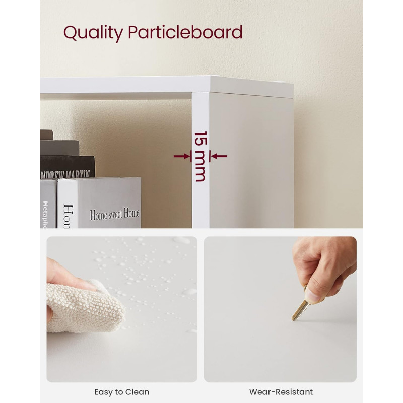 Robust si stabil: Fabricat din placi aglomerate cu grosimea de 15 mm, acest raft de carti este stabil si puternic. Fiecare compartiment are o capacitate de pana la 10 kg si ofera un suport puternic pentru decoratiunile dvs. preferate. Kit anti-inclinare inclus: Fixati acest organizator de depozitare a cuburilor pe perete cu kitul anti-inclinare furnizat si creati un mediu mai sigur pentru familia dvs. Un raft, multe utilizari: Depozitati carti in biroul de acasa, folositi-l ca separator de camera in camera de zi sau organizati hainele in dormitor. Folositi acest raft de depozitare asa cum doriti! Ascundeti-va lucrurile in cutiile de depozitare pentru a le feri de praf, apoi puneti cutiile in compartimentele cu dimensiuni de 29 x 30,5 x 30,5 cm fiecare pentru a va pastra spatiul ordonat.