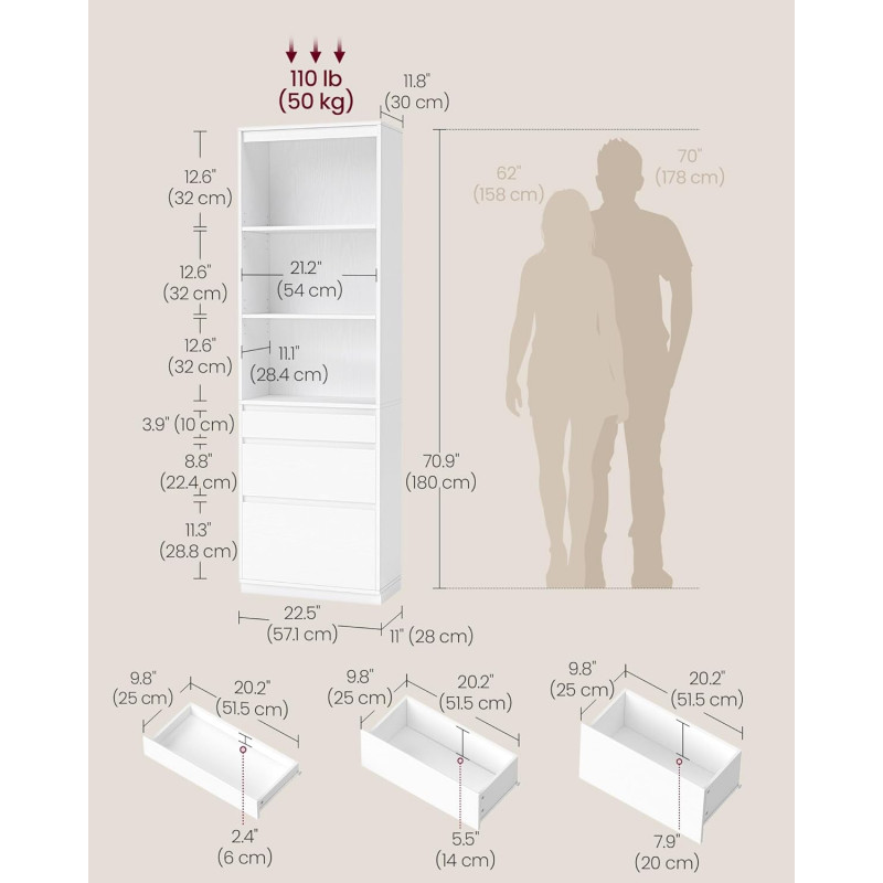 Scurta descriere Biblioteca moderna din colectia KAILYN, cu 3 sertare fara manere si polite reglabile. Design minimalist in alb, potrivit pentru living, dormitor sau birou, oferind spatiu generos de depozitare pe o suprafata redusa.