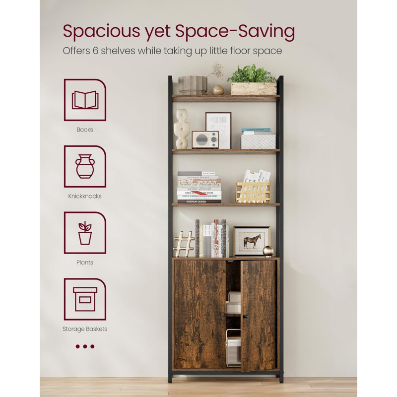 Scurta descriere: VASAGLE Biblioteca cu 6 polite si compartiment inchis combina depozitarea deschisa cu spatiul ascuns pentru un plus de organizare. Cadrul metalic negru se imbina armonios cu politele maro rustic, oferind un aspect modern cu influente industriale. Ideala pentru living, dormitor sau birou.