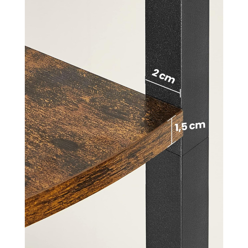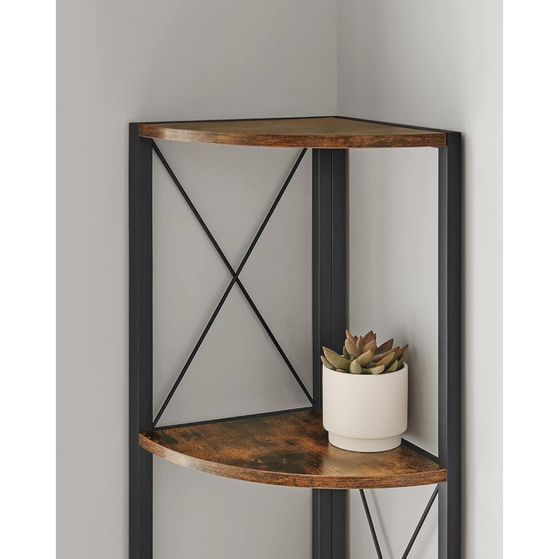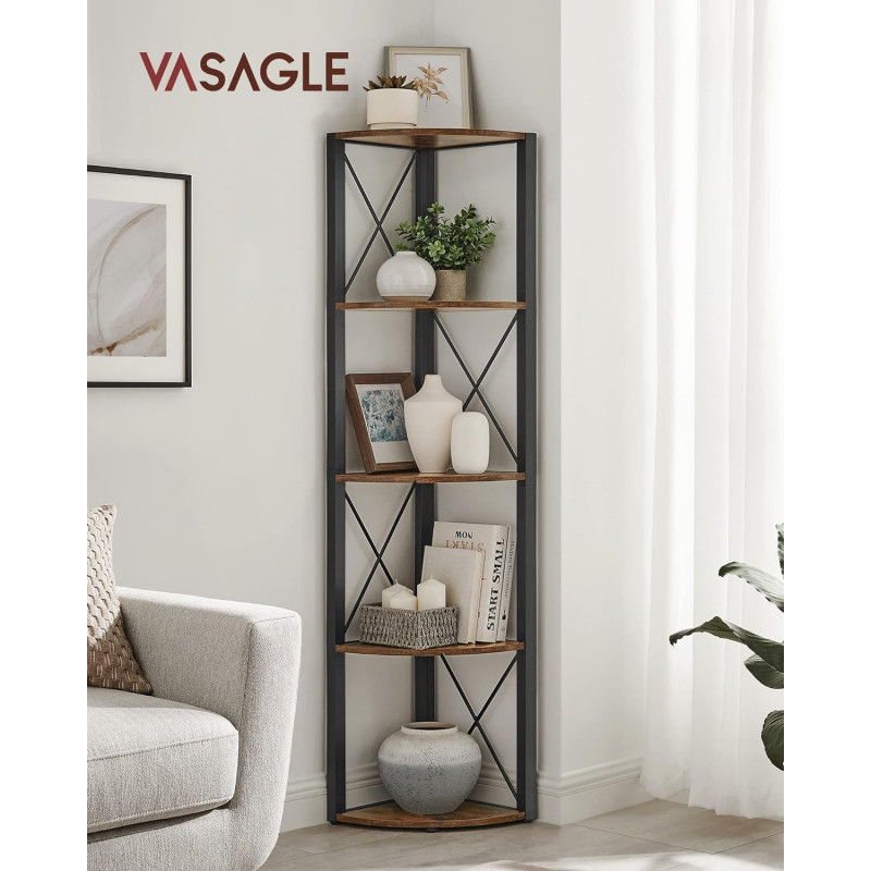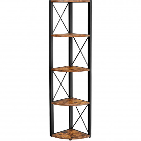 Economie de spatiu si atractiv: Acest raft de colt pe podea valorifica la maximum un colt gol! Cu rafturi maro rustice si bare negre in forma de X, acesta adauga si un pic de caracter Utilizati-l acolo unde aveti nevoie: Puteti folosi acest raft de colt cu 5 niveluri pentru camera de zi pentru a va depozita fotografiile, decoratiunile si cartile, in bucatarie pentru condimentele dvs., in baie pentru sampon, parfum si gel de dus Montaj usor - Cu piese etichetate si