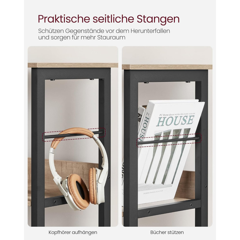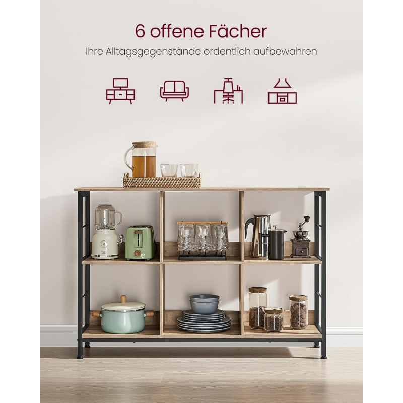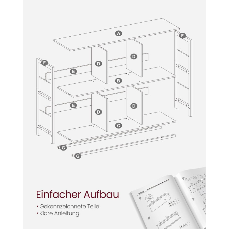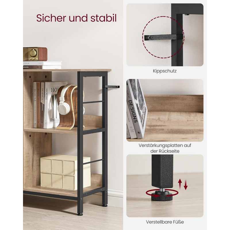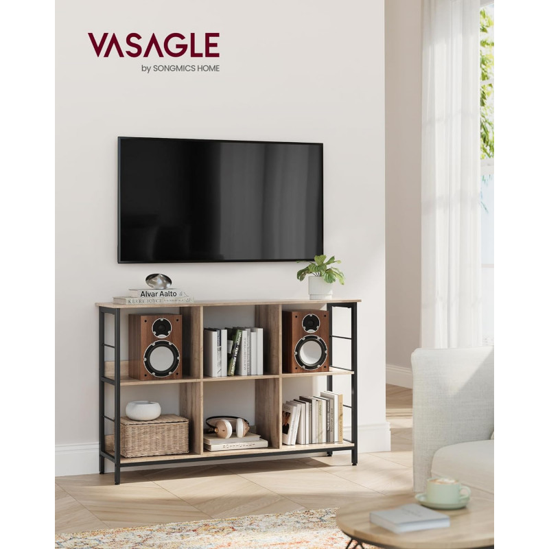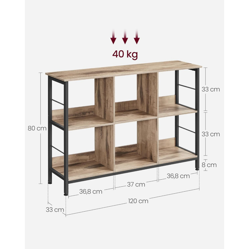 instructiuni Note VASAGLE: Din motive de siguranta, va rugam sa atasati aceasta biblioteca la perete cu ajutorul kitului inclus de anti-rasturnare Rustic industrial Amestecul elegant de maro camel si negru creeaza o ambianta vintage si industriala, facand din aceasta biblioteca rolul principal al casei dvs. Depozitare Aceasta biblioteca cu 6 cuburi va satisface toate nevoile. Poate fi folosita in camera de zi pentru expunerea decoratiunilor, in birou pentru depozitarea cartilor sau in bucatarie pentru depozitarea sticlelor si borcanelor Stabila si robusta Marginile ridicate de pe spate si barele de otel de pe laturi ofera un plus de stabilitate. Datorita picioarelor reglabile, totul este bine echilibrat chiar si pe suprafete usor inegale. Fara probleme de stabilitate! Bare laterale practice Barele de otel de pe laterale impiedica caderea obiectelor dvs. In plus, puteti agata casti, palarii, esarfe si alte articole, totul ramane intotdeauna la indemana Asamblare, fara puzzle-uri Teama de asamblare? Noi va vom ajuta! Acest raft vine cu