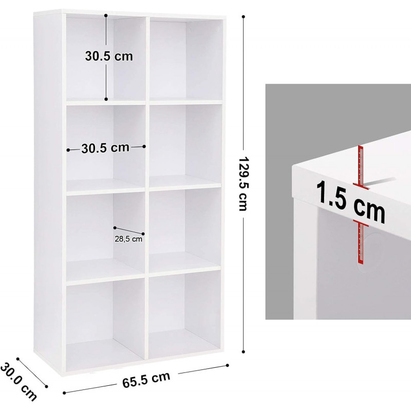 Dimensiunile produsului: 30 D x 129,5 W x 65,5 H centimetri Despre acest articol Pentru iubitorii de carti cu gust: nu sacrifica stilul atunci cand adaugi spatiu de stocare in casa ta; aceasta biblioteca moderna cu finisaj alb (65,5 x 30 x 129,5 cm) ofera 8 cuburi de depozitare deschise pentru colectiile dvs. de carti si viniluri in 25,4 cm (10").Mai sigur: placile laterale sunt proiectate cu caneluri pentru introducerea cu usurinta a panoului; imbunatatit cu cleme pentru panou si vine cu un dispozitiv unic anti-rasturnare pentru a stabiliza si ancora raftul de sine statator.Finisaj profesional: Toate marginile au fost sigilate si fiecare gaura pentru surub vine cu un autocolant pentru a ascunde surubul, prezentand o unitate de depozitare cub de sine statatoare, care este sigura, fara griji si sofisticata.Depozitare inteligenta: Nu numai ca este perfect ca un raft de carti sau un organizator de fisiere in camera de studiu sau un raft pentru jucarii in camera copiilor, dar poate fi folosit si ca suport TV in camera de zi sau dormitor atunci cand este asezat orizontal; se imbina bine cu alte piese de mobilier.Usor de asamblat: aceasta unitate de depozitare a bibliotecii este usor de asamblat, deoarece vine cu piese etichetate si