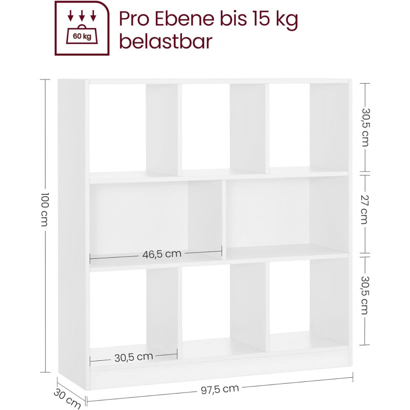 Spatios si practic: 97,5 x 100 x 30 cm (L x A x A), raftul despartitor de camera are doua compartimente deschise si un compartiment din spate care poate fi umplut cu carti, suveniruri si decoratiuni intr-o varietate de moduri si cu acces usor.
