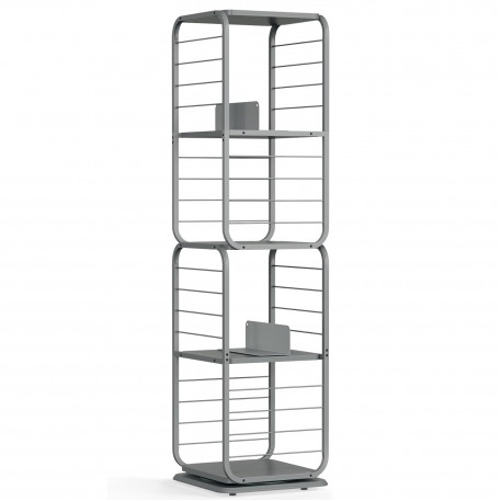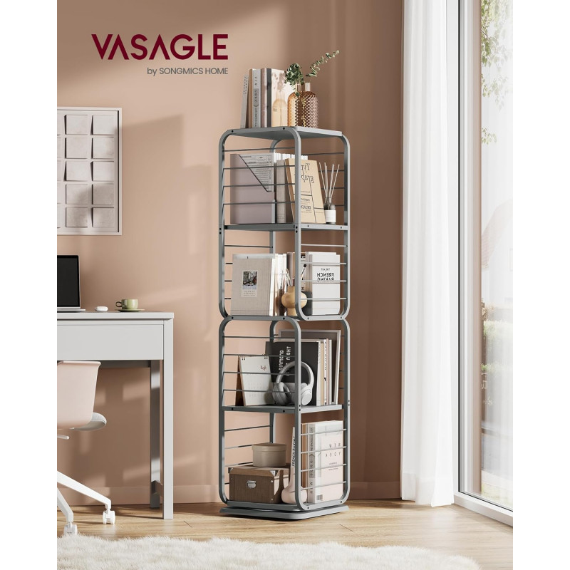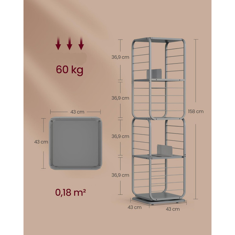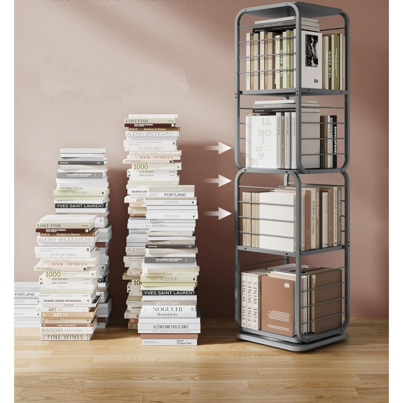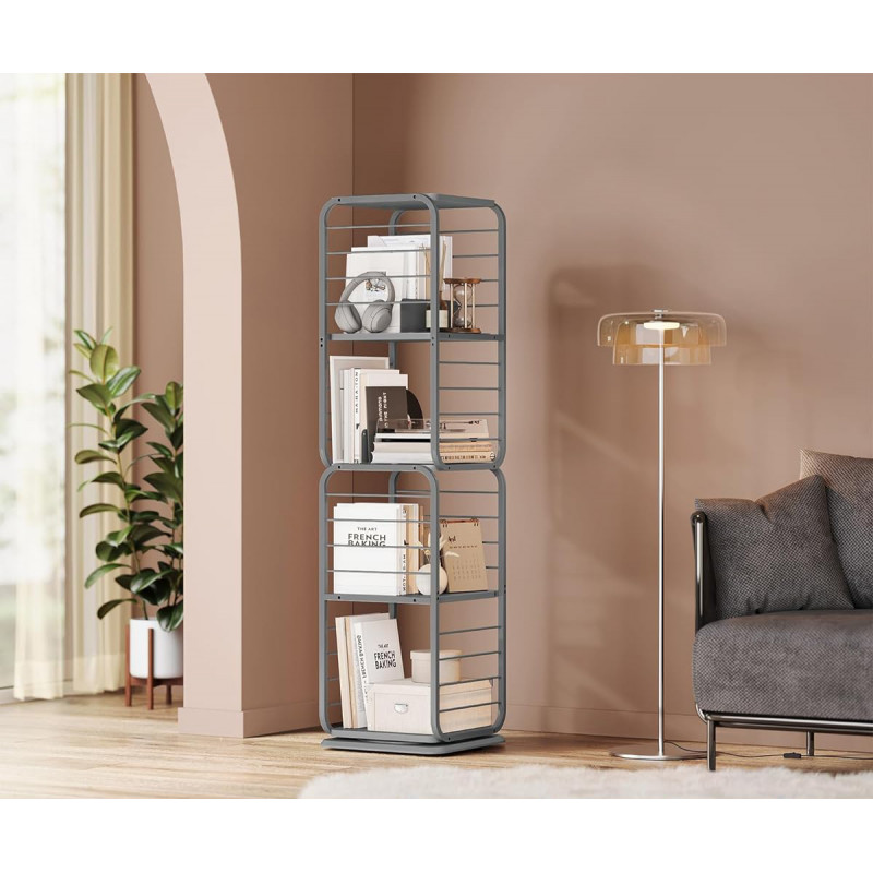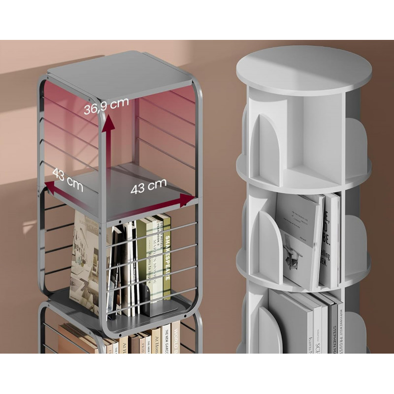 Capacitate de incarcare statica totala: 60 kg Despre acest articol Biblioteca rotativa la 360°: Cu designul sau inovator rotativ, cartea dvs. preferata este doar la o rotire distanta. Protectiile laterale din sarma asigura ca obiectele nu vor cadea in timpul rotatiei, iar rafturile spatioase cu spatiere mare gazduiesc in siguranta cartile mai mari.Avand dimensiunile de 43 x 43 x 158 cm, aceasta biblioteca se potriveste perfect intr-un colt, dar poate gazdui aproximativ 80-100 de carti de dimensiuni medii. Cele doua suporturi de carti incluse impart fiecare nivel in sectiuni mai mici si pot fi indepartate pentru utilizare separata.Compacta si eleganta, aceasta biblioteca se potriveste cu o varietate de stiluri de decorare a locuintei, fiind un accesoriu elegant pentru camera de zi, biroul de acasa sau dormitorul dvs.Aceasta biblioteca rotativa este prevazuta cu un kit anti-inclinare pentru un plus de siguranta. De asemenea, include patru picioare reglabile pentru a asigura stabilitatea, chiar si pe podele usor denivelate. Cu