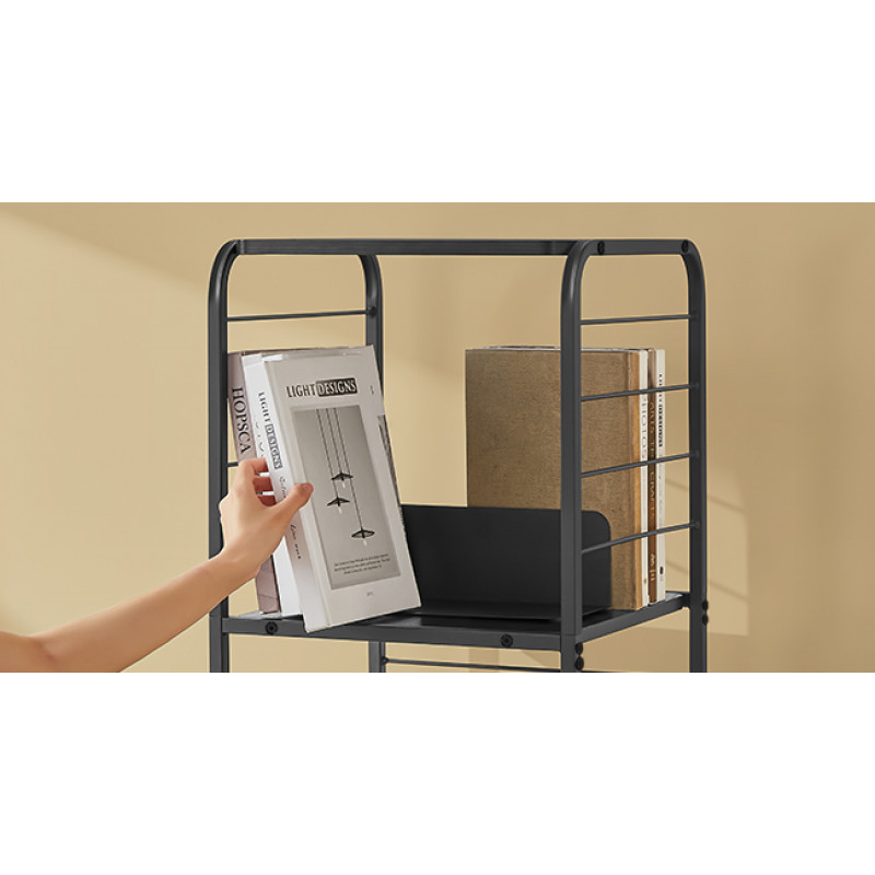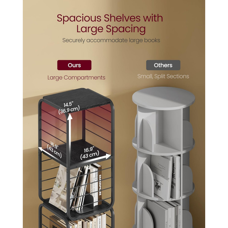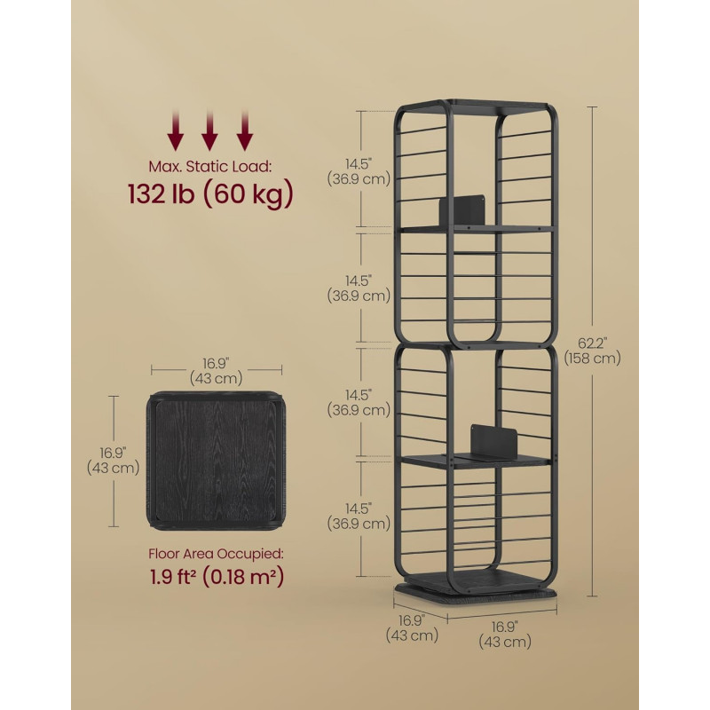 Capacitate de incarcare statica totala: 60 kg Despre acest articol Biblioteca rotativa la 360°: Cu designul sau inovator rotativ, cartea dvs. preferata este doar la o rotire distanta. Protectiile laterale din sarma asigura ca obiectele nu vor cadea in timpul rotatiei, iar rafturile spatioase cu spatiere mare gazduiesc in siguranta cartile mai mari.Avand dimensiunile de 43 x 43 x 158 cm, aceasta biblioteca se potriveste perfect intr-un colt, dar poate gazdui aproximativ 80-100 de carti de dimensiuni medii. Cele doua suporturi de carti incluse impart fiecare nivel in sectiuni mai mici si pot fi indepartate pentru utilizare separata.Compacta si eleganta, aceasta biblioteca se potriveste cu o varietate de stiluri de decorare a locuintei, fiind un accesoriu elegant pentru camera de zi, biroul de acasa sau dormitorul dvs.Aceasta biblioteca rotativa este prevazuta cu un kit anti-inclinare pentru un plus de siguranta. De asemenea, include patru picioare reglabile pentru a asigura stabilitatea, chiar si pe podele usor denivelate. Cu