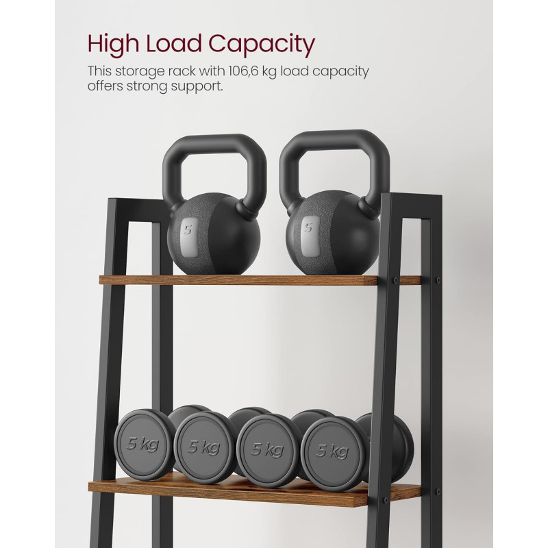 Max. Capacitate de incarcare statica a fiecarui nivel: 5 kg Despre acest articol Proiectat dintr-un cadru solid, intarit de bare in forma de X, echilibrat de picioare reglabile si asigurat de un kit anti-inclinare, acest raft este foarte stabil.Realizat cu un cadru solid din otel si placi aglomerate de calitate, acest raft cu 5 nivele este durabil pentru o utilizare pe termen lung.Acest raft de depozitare cu dimensiuni de 32 x 56 x 172 cm ofera mult spatiu, ocupand in acelasi timp putin spatiu pe podea. Rafturile sunt la o distanta de 33 cm unul fata de celalalt si tin chiar si obiectele mai inalte.Folositi-l ca raft de depozitare in camera de zi, ca suport pentru plante pe balcon, ca raft de carti in biroul de acasa sau ca raft de depozitare in bucatarie - oriunde l-ati amplasa, este intotdeauna util.Piesele numerotate si