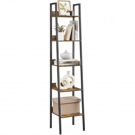 Scurta descriere Biblioteca tip scara VASAGLE este solutia ideala pentru spatii inguste, valorificand eficient inaltimea incaperii. Designul industrial, combinatia de PAL cu finisaj maro vintage si cadrul metalic negru, o fac potrivita pentru living, birou, dormitor sau bucatarie. Rafturile deschise permit organizarea practica a cartilor si obiectelor decorative.