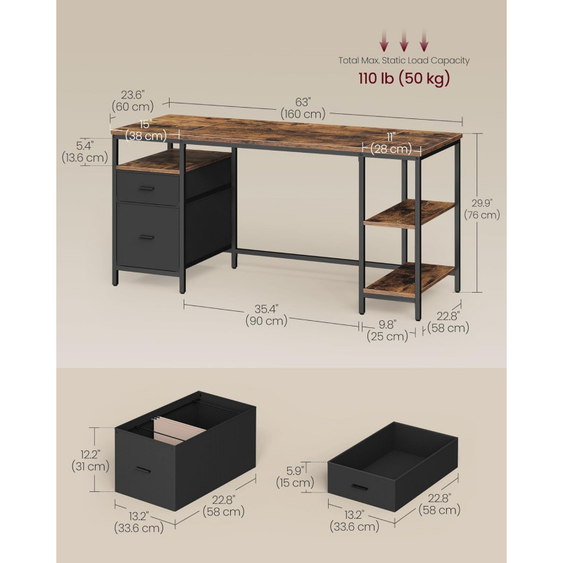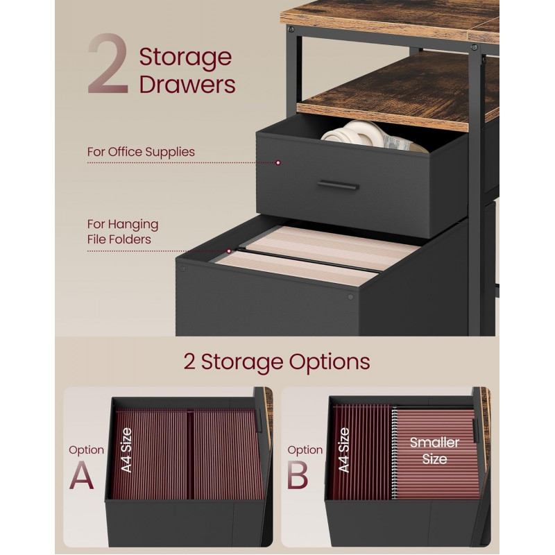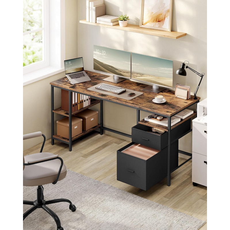 Scurta descriere: VASAGLE Birou calculator cu spatiu generos de lucru si multiple optiuni de depozitare este ideal pentru birou acasa sau zona de studiu. Cele 2 sertare, rafturile laterale si compartimentul pentru documente ajuta la organizarea eficienta a accesoriilor si dosarelor. Structura metalica robusta si designul industrial ofera stabilitate si un aspect modern.