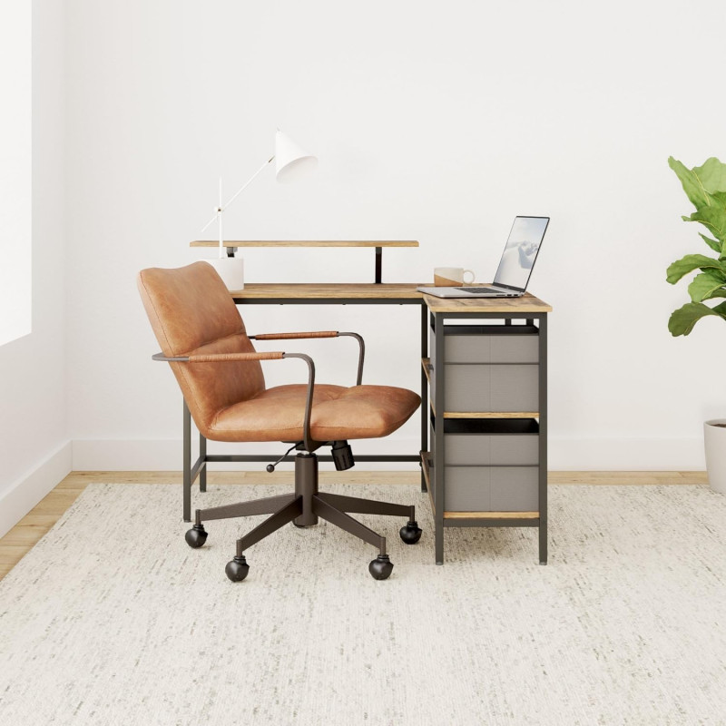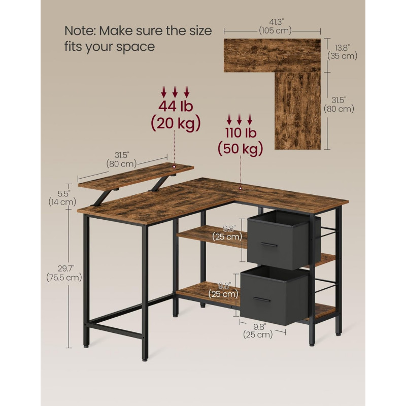 Scurta descriere Biroul de colt VASAGLE in forma L este conceput pentru organizarea eficienta a spatiului de lucru. Blatul dublu ofera suprafata generoasa pentru calculator, monitor si accesorii, iar cele doua sertare permit depozitarea documentelor si a obiectelor de birou. Designul industrial cu finisaj maro vintage si cadru metalic se potriveste in birou, dormitor sau zona de gaming.