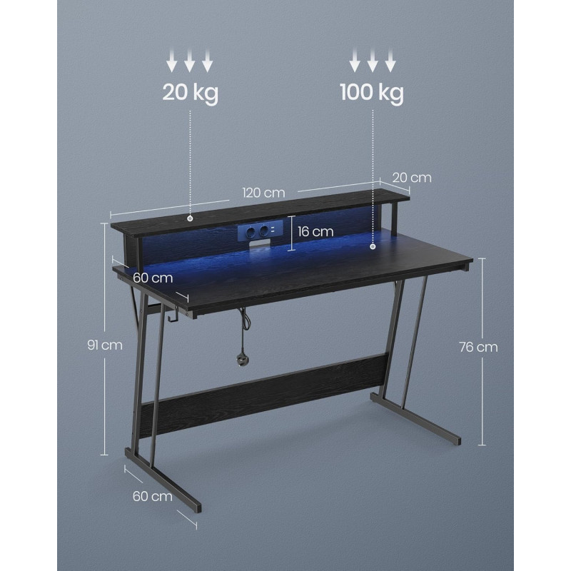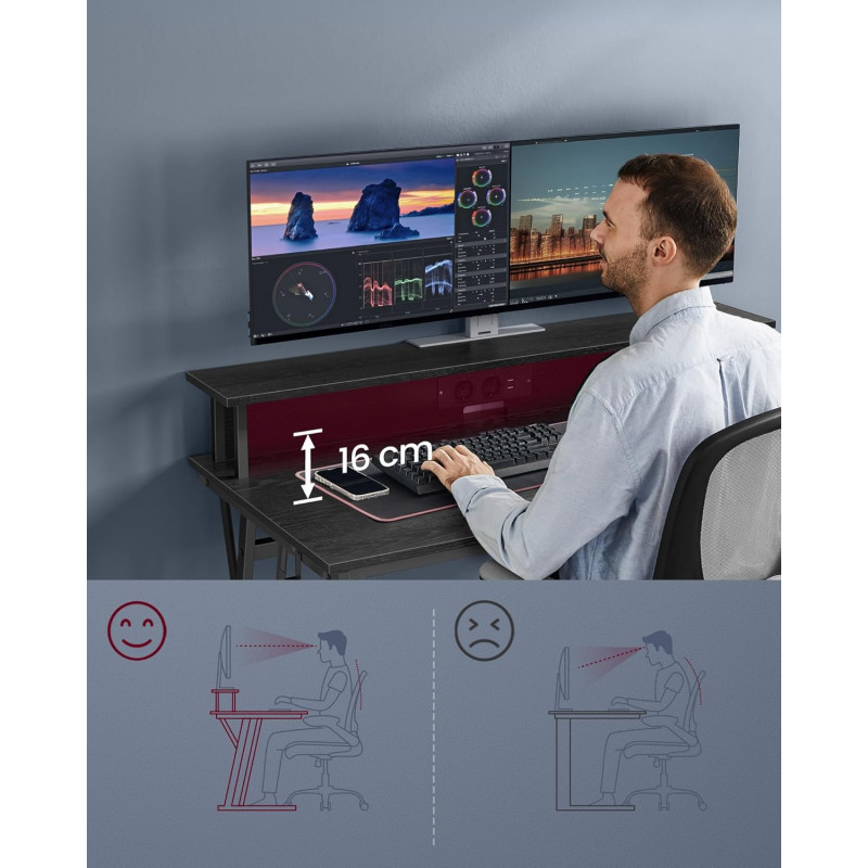 Scurta descriere Biroul VASAGLE pentru gaming combina design modern cu functionalitate extinsa. Este echipat cu banda LED multicolora si priza incorporata pentru alimentarea dispozitivelor. Suportul pentru doua monitoare ajuta la mentinerea unei pozitii corecte si la organizarea eficienta a spatiului de lucru.