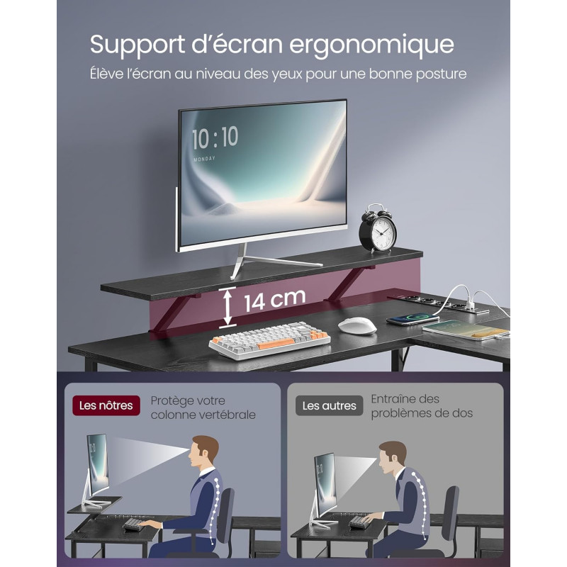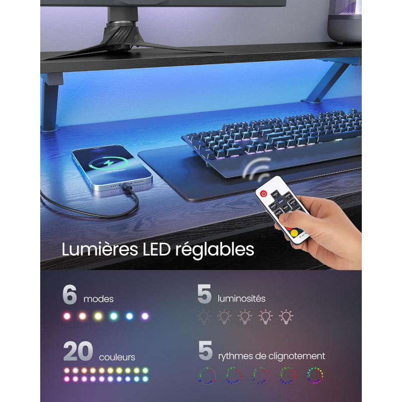 Pachetul include: 1 x birou in forma de L1 x set de accesorii1 x manual de utilizare Flexibil si multifunctional Acest birou in forma de L are un design reversibil, permitandu-va sa instalati sertarele fie in stanga, fie in dreapta, facandu-l biroul perfect pentru scris, studiu sau joaca. Ambianta personalizabila Echipat cu iluminare LED integrata, acest birou de colt ofera 20 de culori, 6 moduri de clipire, 5 niveluri de luminozitate si 5 viteze de clipire, astfel incat sa puteti personaliza cu usurinta ambianta camerei dvs. Stimulati-va productivitatea 4 prize de curent alternativ si 2 porturi USB incarca cu usurinta telefoanele, computerele si multe altele. Prin ridicarea ecranului la nivelul ochilor, suportul pentru monitor promoveaza o postura buna si reduce oboseala gatului. Spatios si robust 2 sertare si un raft va mentin spatiul de lucru organizat. Fabricat cu un cadru din otel si traverse ranforsate, acest birou pentru calculator suporta pana la 50 kg pe birou si 20 kg pe suportul pentru monitor. Robust, usor de asamblat Picioarele reglabile asigura stabilitatea biroului in forma de L cu prize si previn vibratiile nedorite. Structura simpla, piesele numerotate si