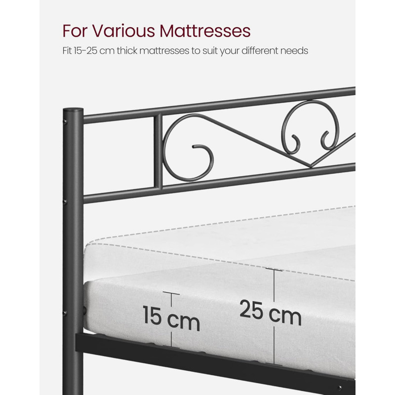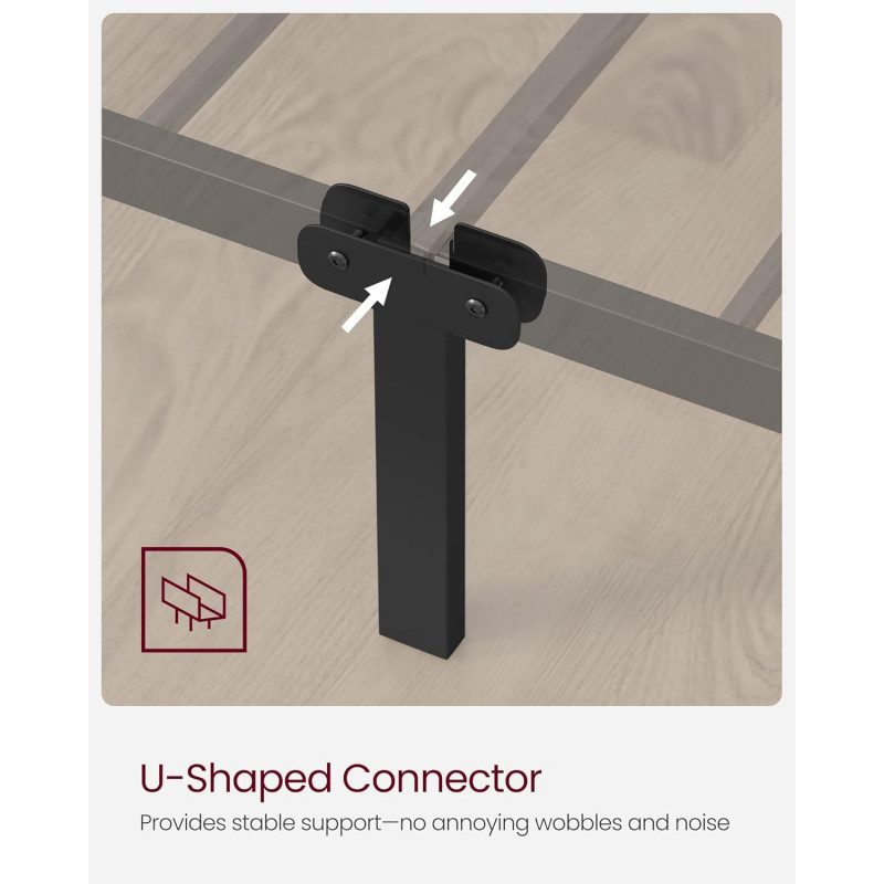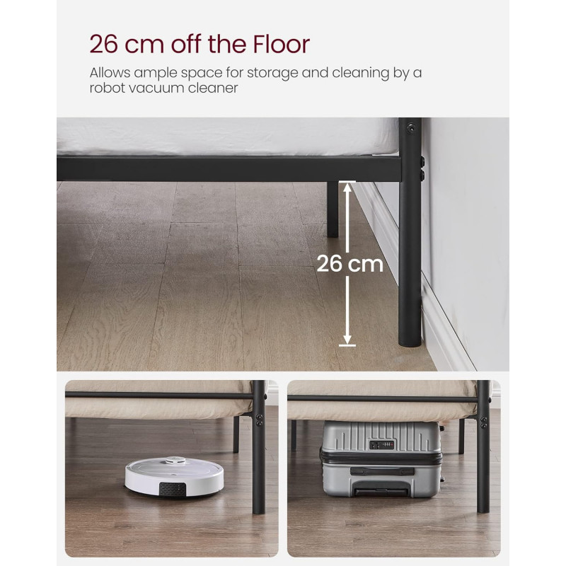 Robust si stabil: Barele de sustinere de inalta calitate si 9 picioare metalice robuste cu conectori metalici in forma de U inzestreaza acest cadru de pat dublu cu o mare stabilitate si o sarcina maxima de 250 kg - fara oscilatii si zgomote enervante Spatiu amplu sub pat pentru depozitare: Cu barele de sustinere la 26 cm de podea, va puteti depozita cutiile de depozitare sub cadrul patului, iar un aspirator robot poate trece prin el pentru o curatare usoara