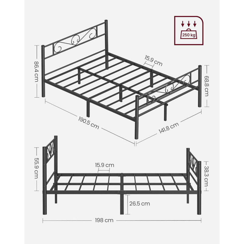 Dimensiune 140 x 190 cm Dimensiuni produs 198 L x 141.8 W x 86.4 H centimetri Caracteristica speciala Robust Culoare negru Tip finisaj Acoperit cu pulbere Material Otel aliat, Metal Stil Modern Greutate maxima recomandata 250 Kilograme Greutatea articolului 19.8 Kilograme Include doar cadru de pat