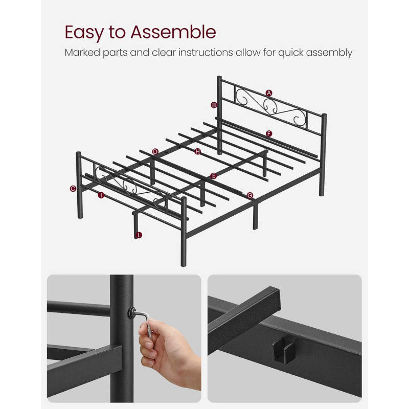Placute pentru picioare incluse: Fiecare picior al acestei rame de pat metalice rezistente este prevazut cu o placuta pentru picioare pentru a reduce zgomotul in timpul miscarii si pentru a proteja podeaua de zgarieturi
