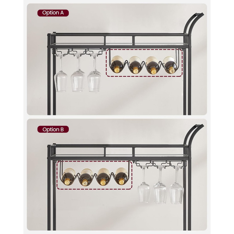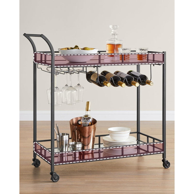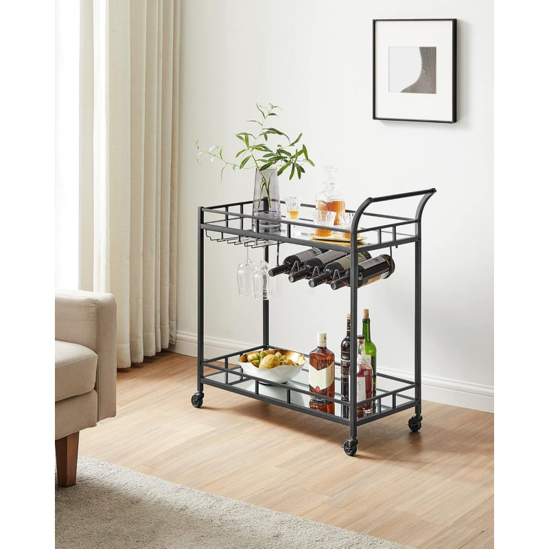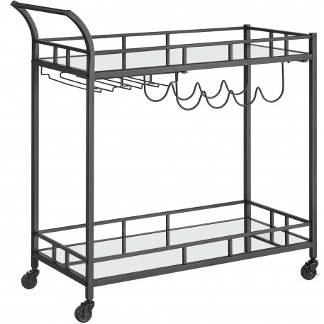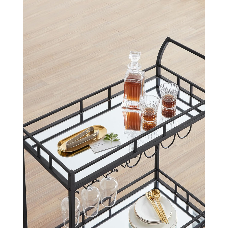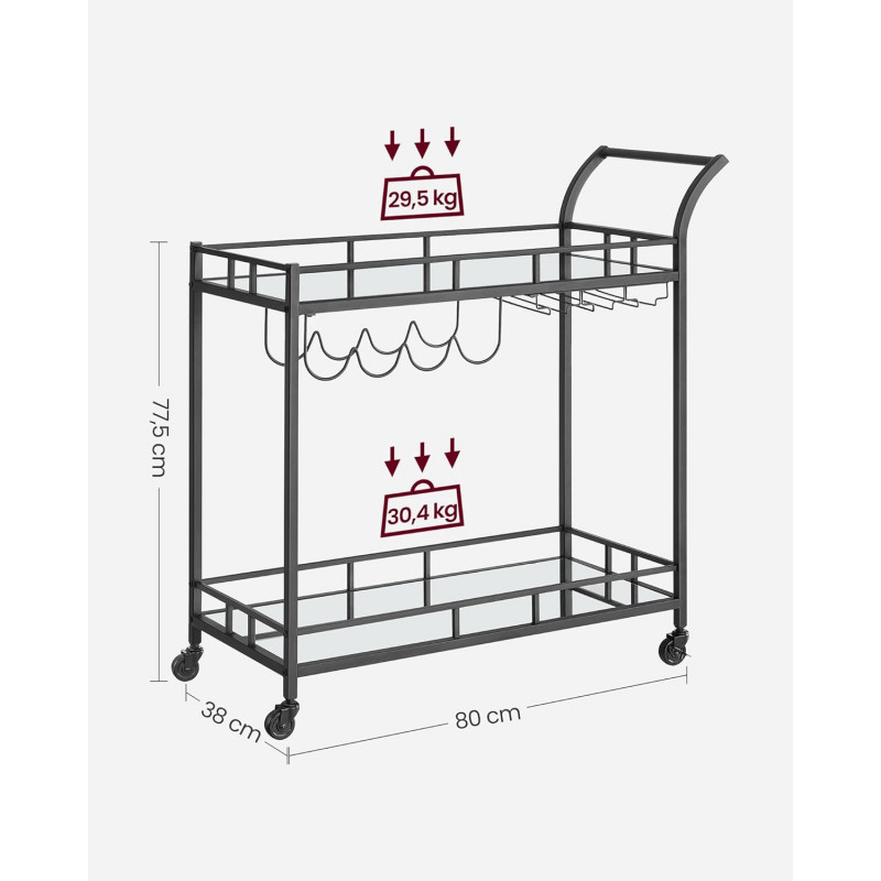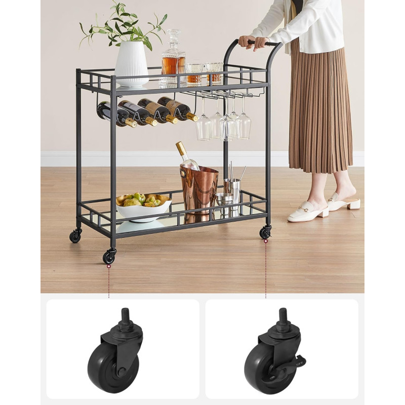 Max. Capacitatea de incarcare statica a raftului inferior: 30,5 kg Despre acest articol Cu dimensiunile sale de 38 x 80 x 77,5 cm si distanta de 51,5 cm intre cele 2 niveluri, acest carucior ofera spatiu suficient pentru zona dvs. de bar. Whisky, gin si rom... puneti bauturile dvs. preferate in el!Cu cele 4 roti ale sale, dintre care 2 cu frane, acest carucior este intotdeauna la dispozitia dumneavoastra.Cu un cadru negru trendy, rafturi din sticla reflectorizanta si maner curbat, acest carucior rulant aduce o nota de lux zonei dvs. de bar sau bucatariei.Asteptati cu nerabdare sa va expuneti sticlele? Nicio problema! Datorita