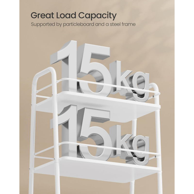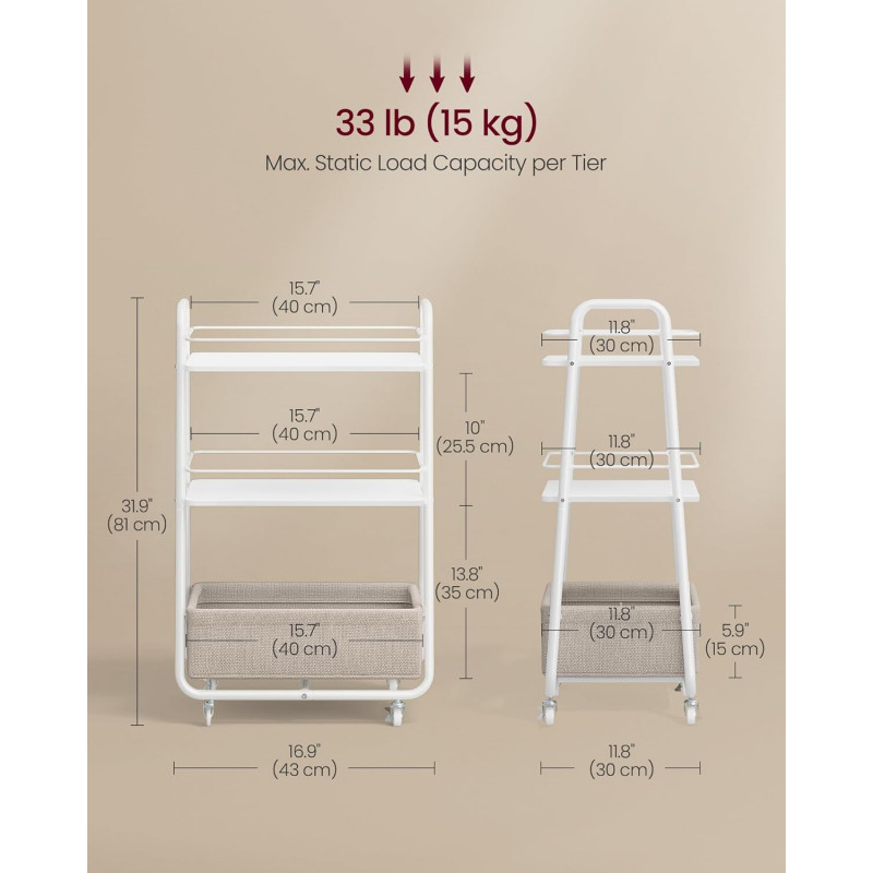 Scurta descriere Carucior de depozitare cu design modern, realizat din metal, PAL si elemente textile. Cele 3 niveluri ofera spatiu practic pentru organizarea obiectelor de zi cu zi, iar cosul textil incapator este ideal pentru reviste, paturi sau accesorii.