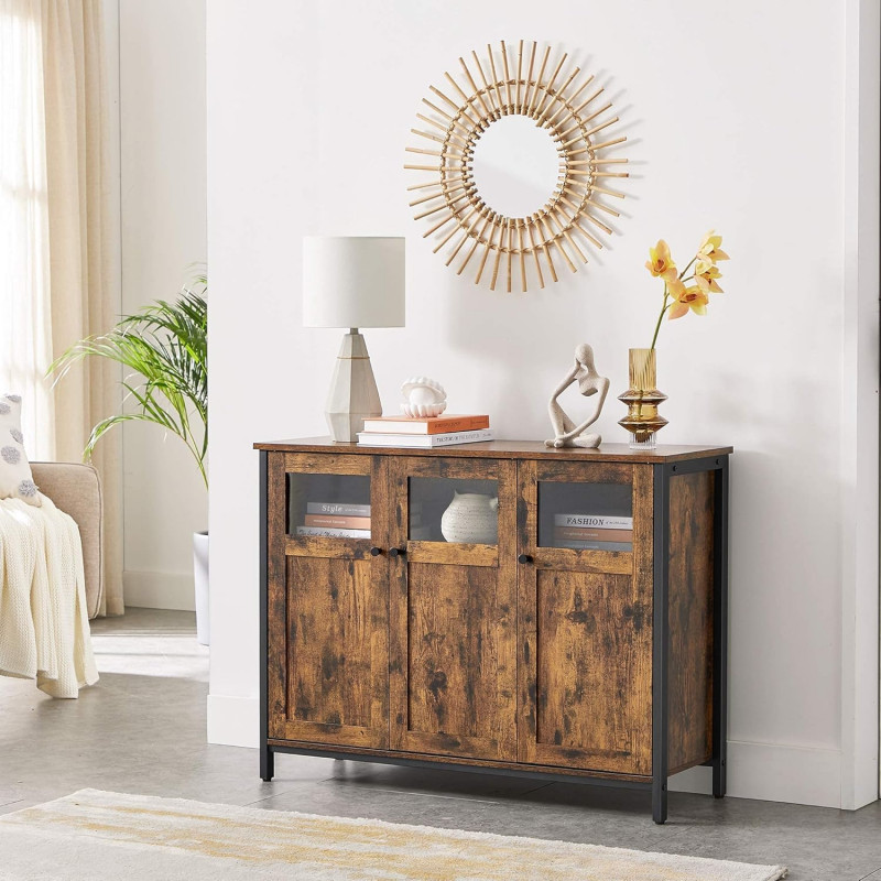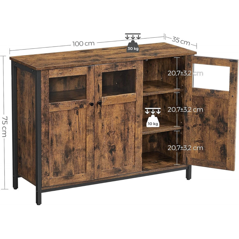 Scurta descriere: VASAGLE Comoda pentru bucatarie in stil industrial imbina finisajul maro vintage cu un cadru metalic negru pentru un aspect modern si cald. Usile cu insertii din sticla permit expunerea eleganta a paharelor sau veselei, in timp ce compartimentele inchise ofera spatiu discret pentru depozitare. Ideala pentru bucatarie, dining sau living.