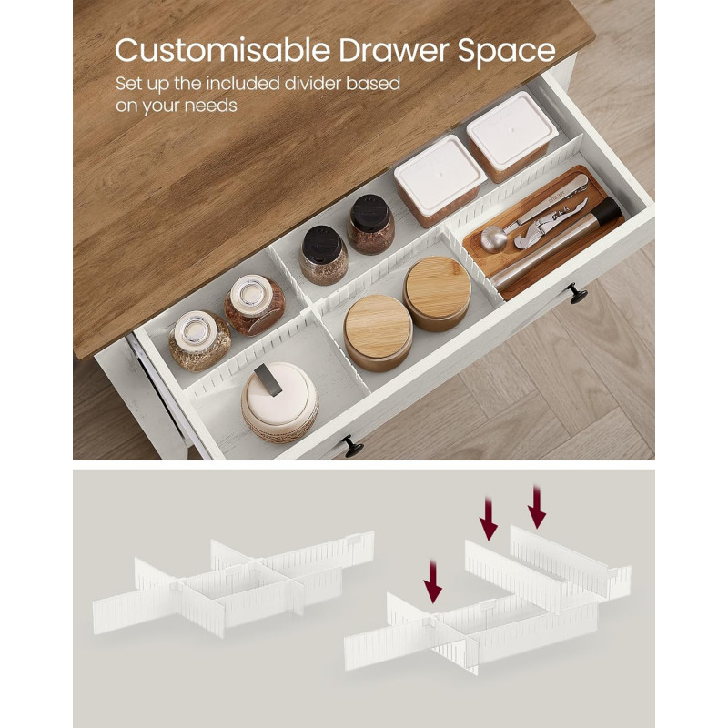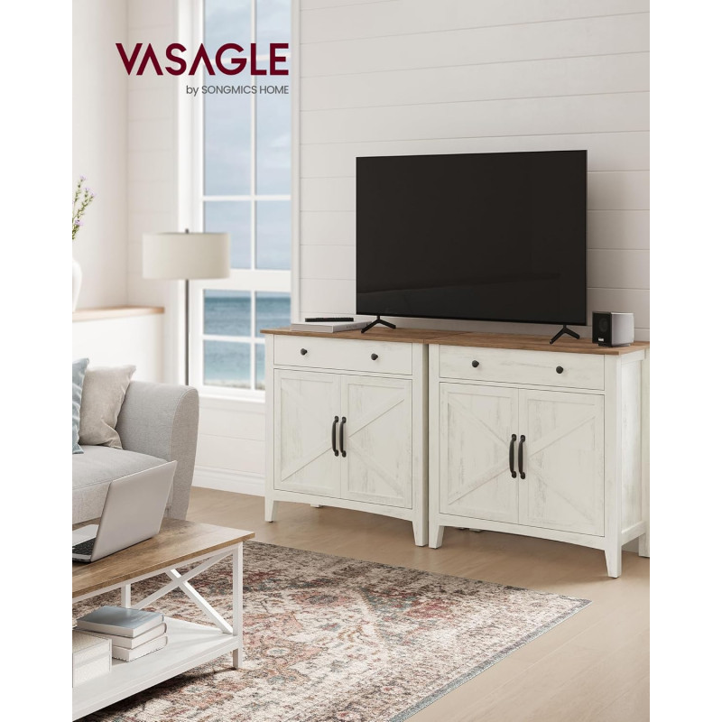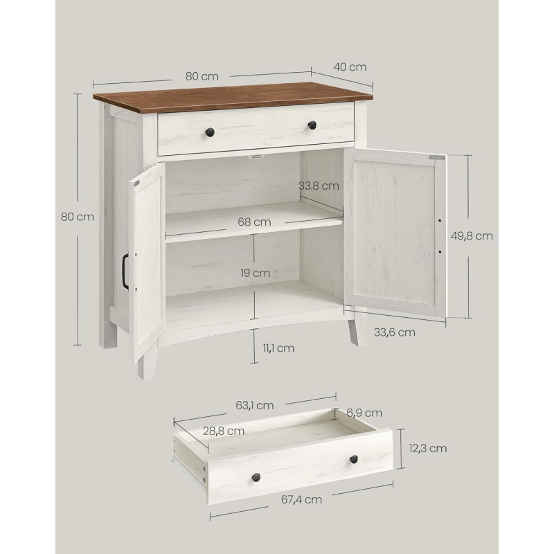 Scurta descriere Comoda VASAGLE in stil country combina alb rustic cu blat in nuanta miere pentru un aspect cald si elegant. Ofera spatiu generos de depozitare prin sertarul incapator si dulapul inferior cu raft reglabil, fiind potrivita pentru living, dining, hol sau bucatarie.
