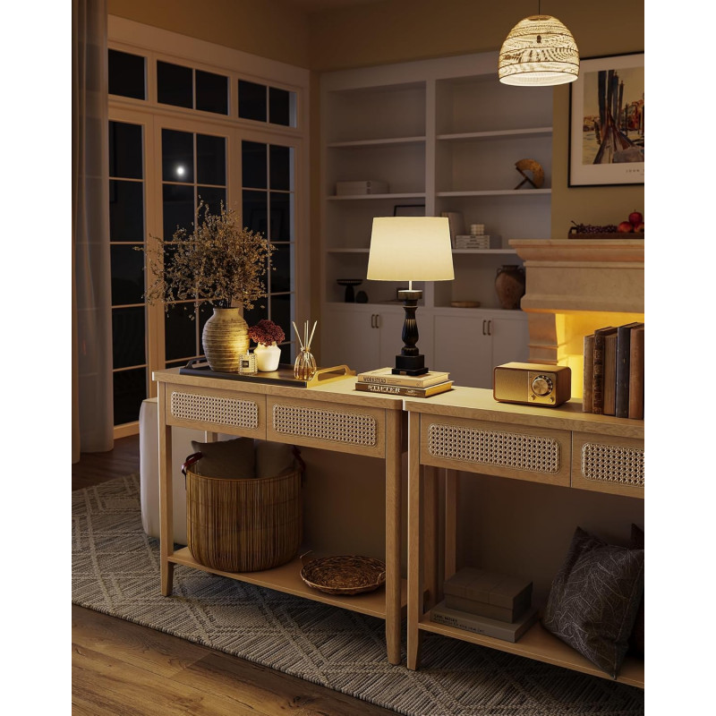 Scurta descriere: Consola VASAGLE este ideala pentru spatiile moderne sau boho, combinand designul natural cu functionalitatea. Cu 2 sertare cu fronturi din ratan PVC, un raft inferior si un blat spatios, ofera solutii eficiente de depozitare pentru obiectele zilnice sau decoratiuni. Finisajul in nuanta bej stejar si colturile rotunjite adauga caldura si rafinament in orice incapere.