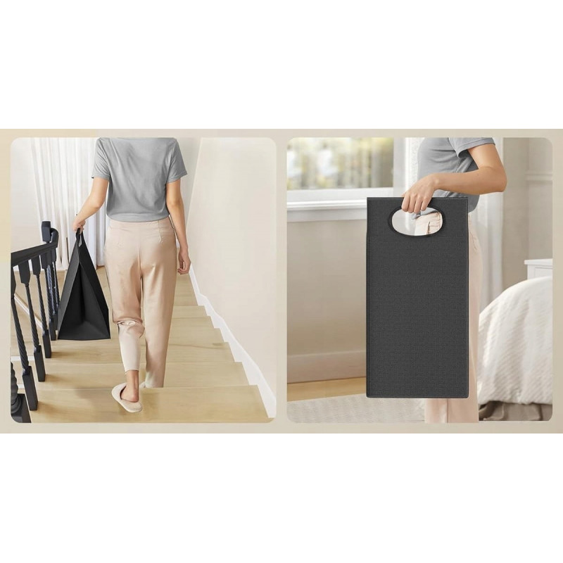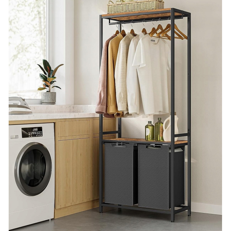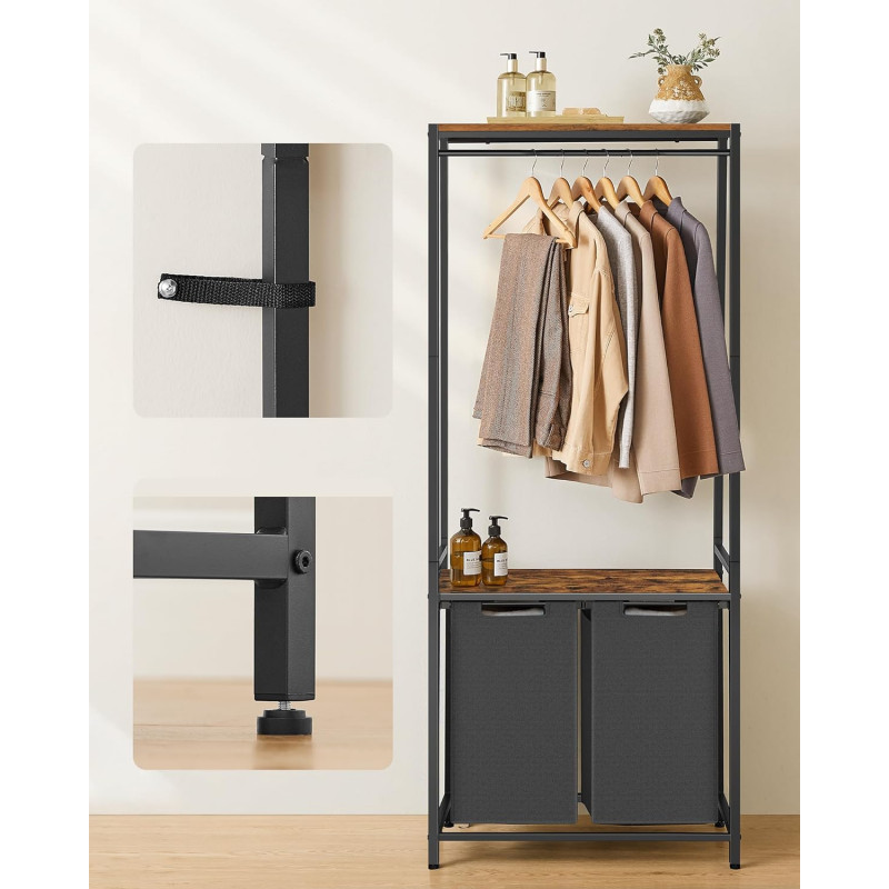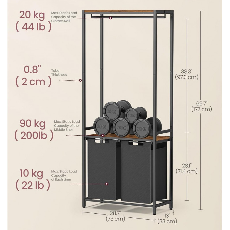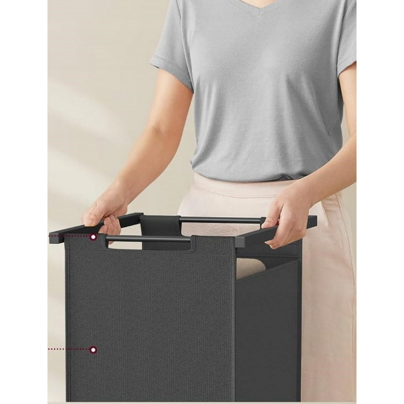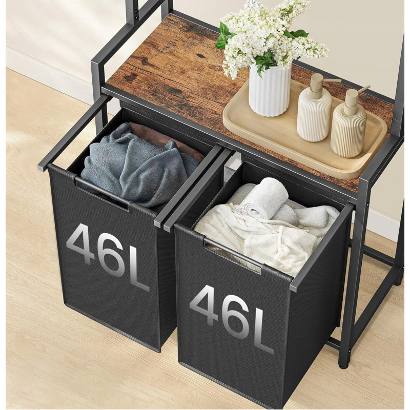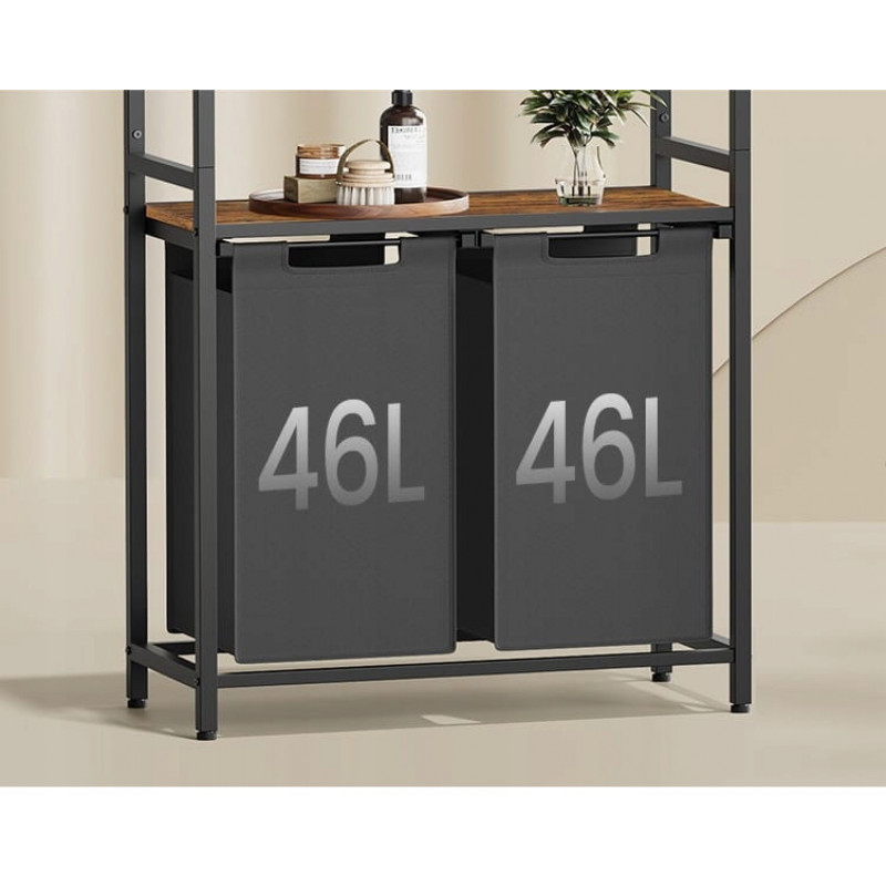 Culoare Maro rustic + Negru clasic Despre acest articol Cos de rufe cu 2 sectiuni: Cu o capacitate totala de 92 L (46 L per captuseala), acest cos de rufe poate gazdui cu usurinta imbracamintea de familie pentru o saptamana. Designul sau cu 2 sectiuni simplifica sortarea rufelor. 2 rafturi de depozitare: Acest cos de rufe vine cu doua rafturi, oferind spatiu amplu pentru organizarea articolelor de toaleta, a articolelor de rufe si multe altele. Raftul din mijloc poate functiona ca o statie de pliere pentru a va facilita rutina de spalat rufe.
